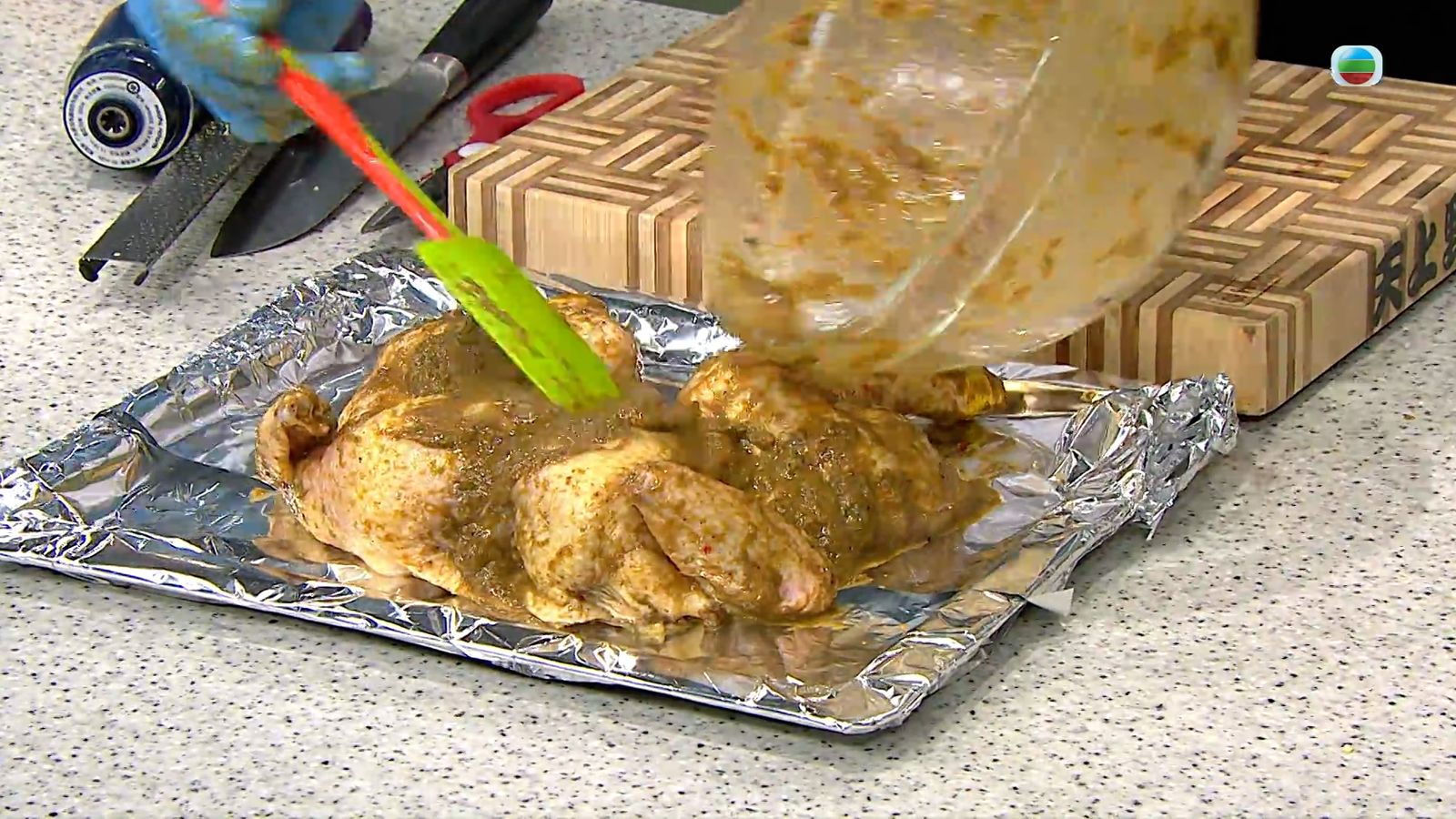 1.黃油雞解凍後洗淨抹乾,剪去脊骨、雞翼尖,在雞髀、雞胸位置的內側各切一刀,將醃料用攪拌器拌勻,塗抹於雞上,放入雪櫃冷藏一晚。