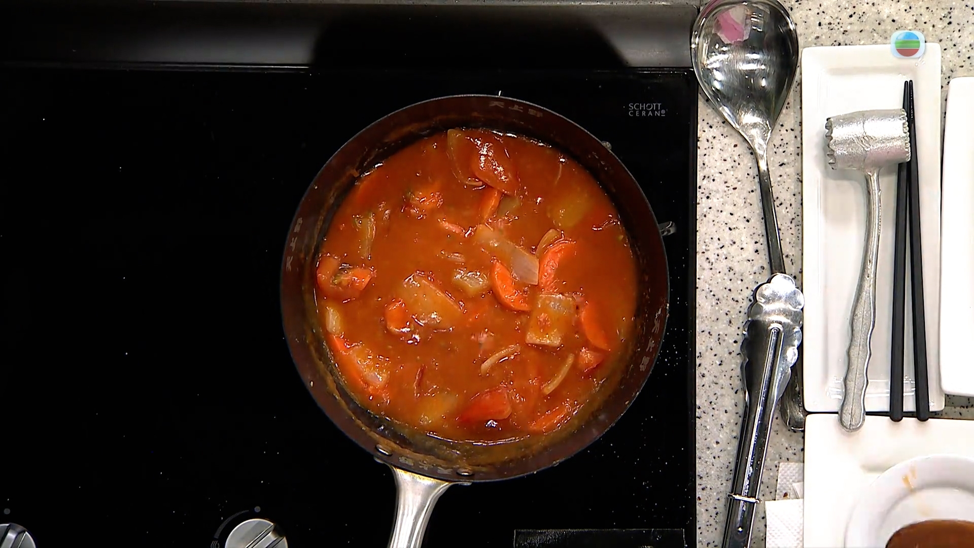 配菜有洋蔥和紅蘿蔔,以油混合牛油起鍋後先把切件的配菜炒香,再加入麵粉炒一會,之後才加入茄汁、茄醬、雞湯和切件番茄煮成稍濃的湯,最後加入少量的菠蘿拌勻備用。