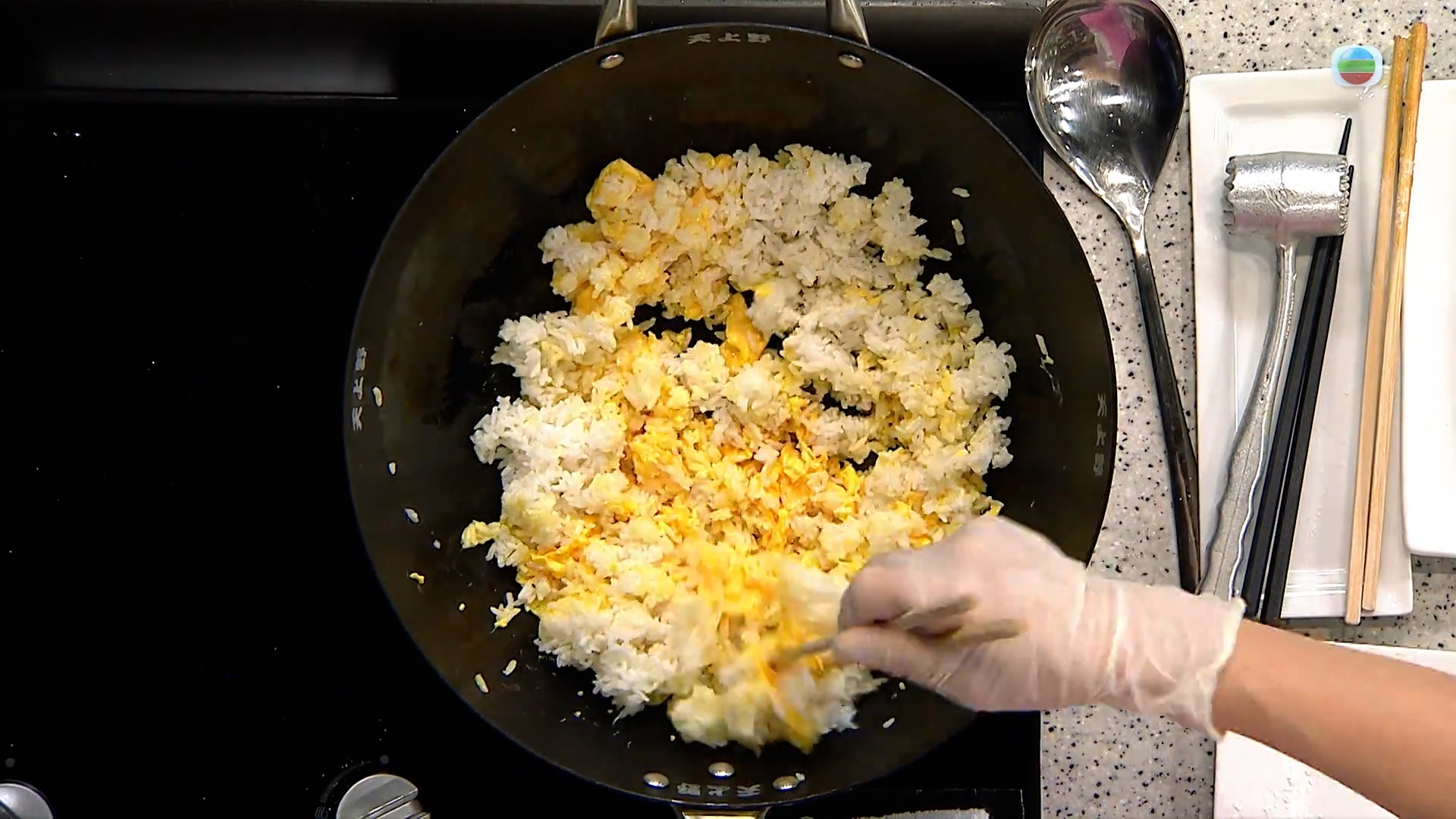 常說炒飯要用隔夜飯,但其實只要飯夠冷就可以,先起油鍋將蛋漿炒半熟,再放入白飯兜炒,稍加調味後加入洋蔥碎炒勻就可以裝入焗盆備用。