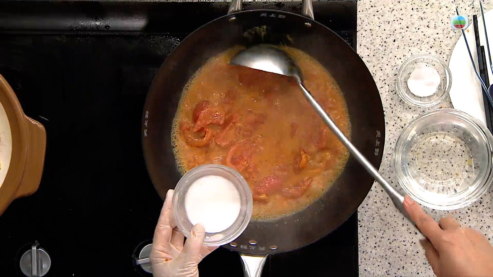 2.鮮茄去皮,放入油鍋煮熟,下番茄調味醬料,注入生粉水略煮,盛起備用。