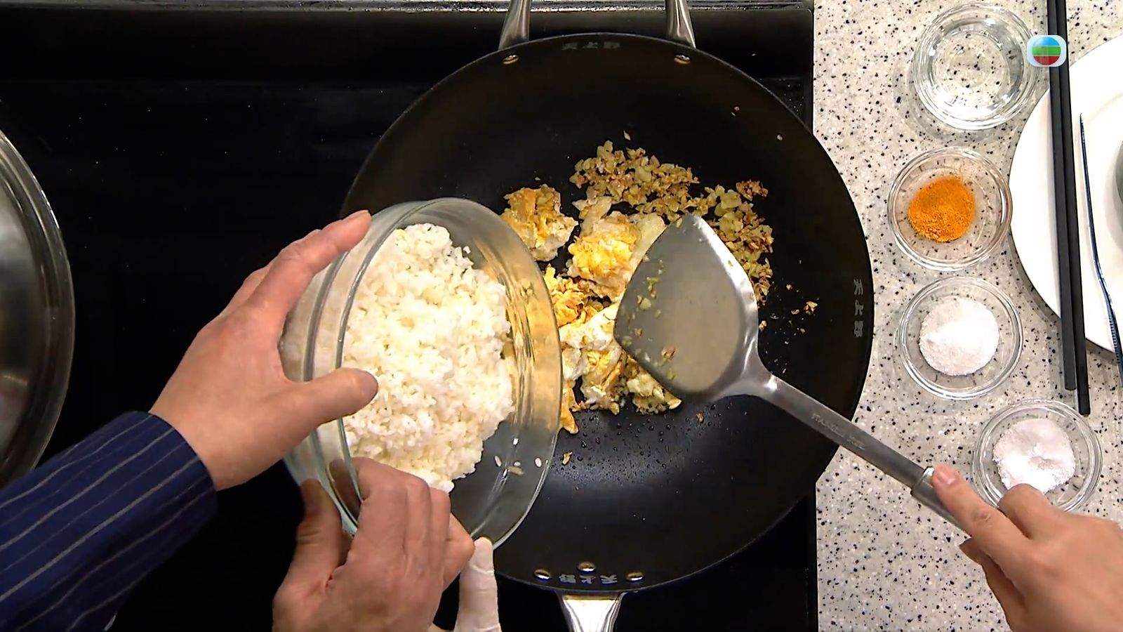 3.起油鍋,先爆香薑粒,放於鍋的一邊,鍋另一邊放入雞蛋分開煎,完成後連同白飯、黃薑粉炒香,置於煲仔內。