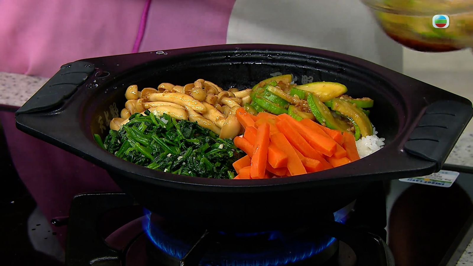 用油塗勻鍋的內部後燒熱,先鋪上白飯,淋少許調味醬汁。上面排放好菠菜、紅蘿蔔、鮮菇及翠玉瓜,蓋上鍋蓋後以中慢火烘熱及烘香。
