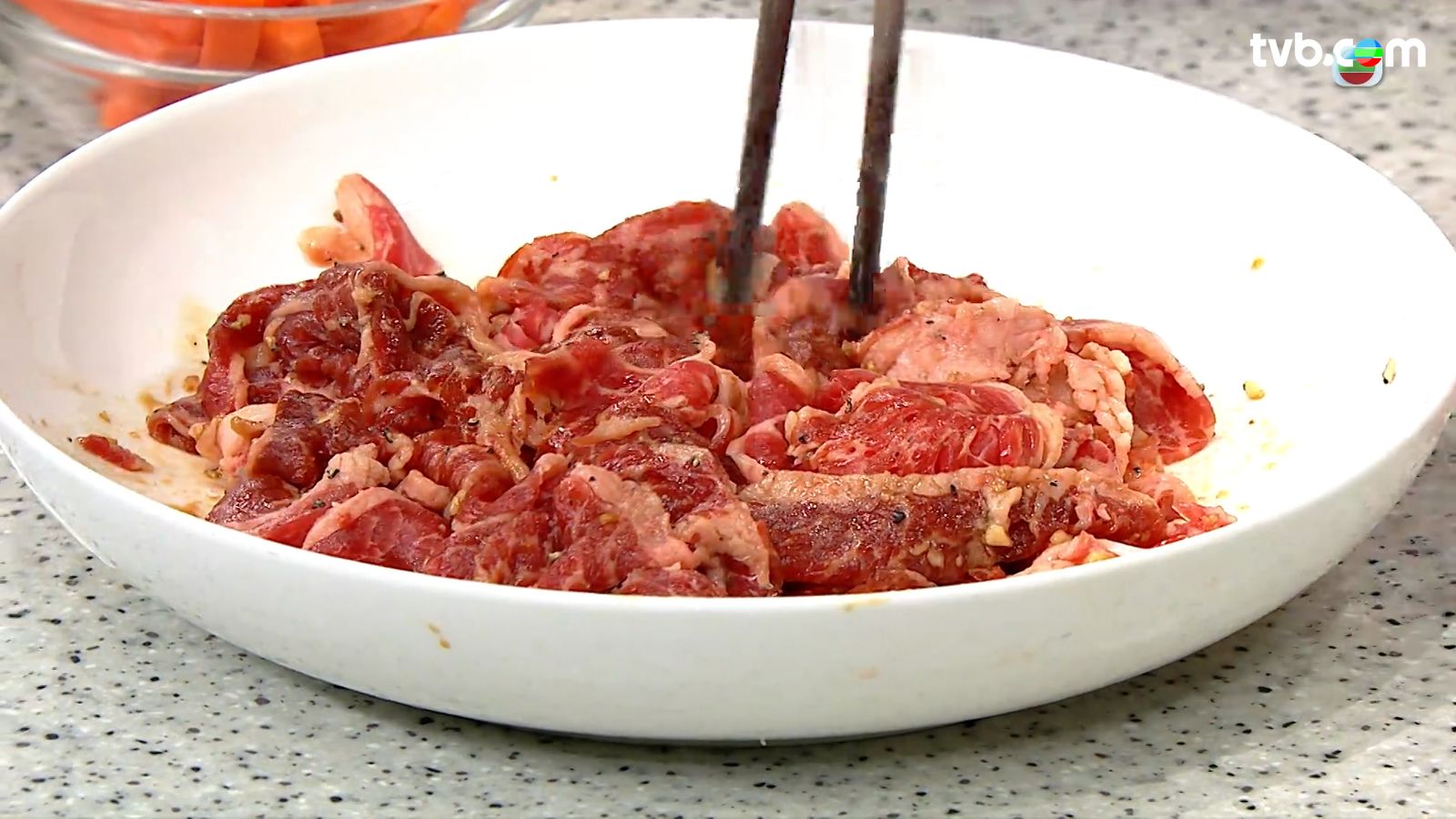 1.薄切肥牛肉片與醃料拌勻待片刻。