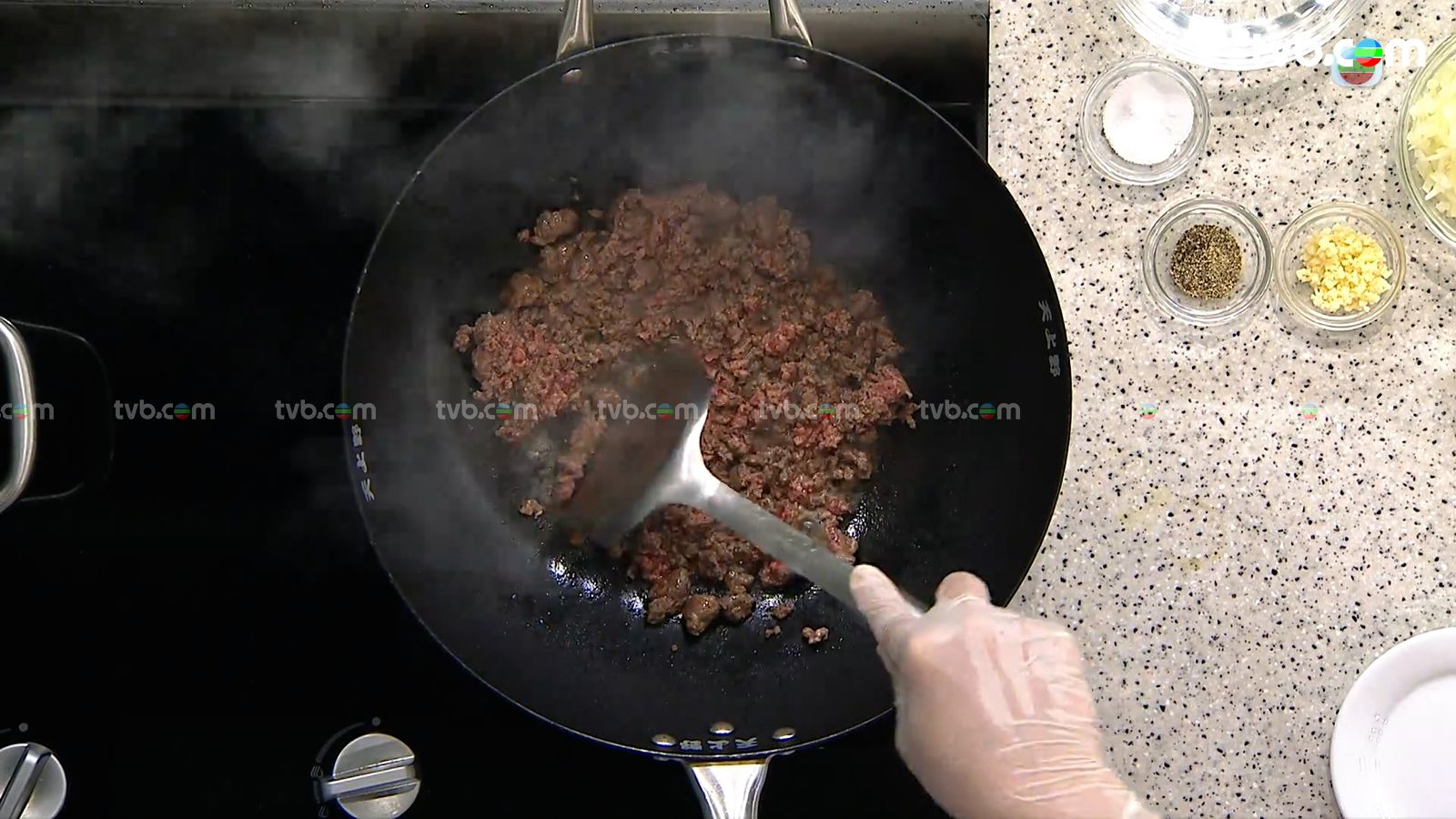 2.免治牛肉下油鍋炒香,盛起備用。