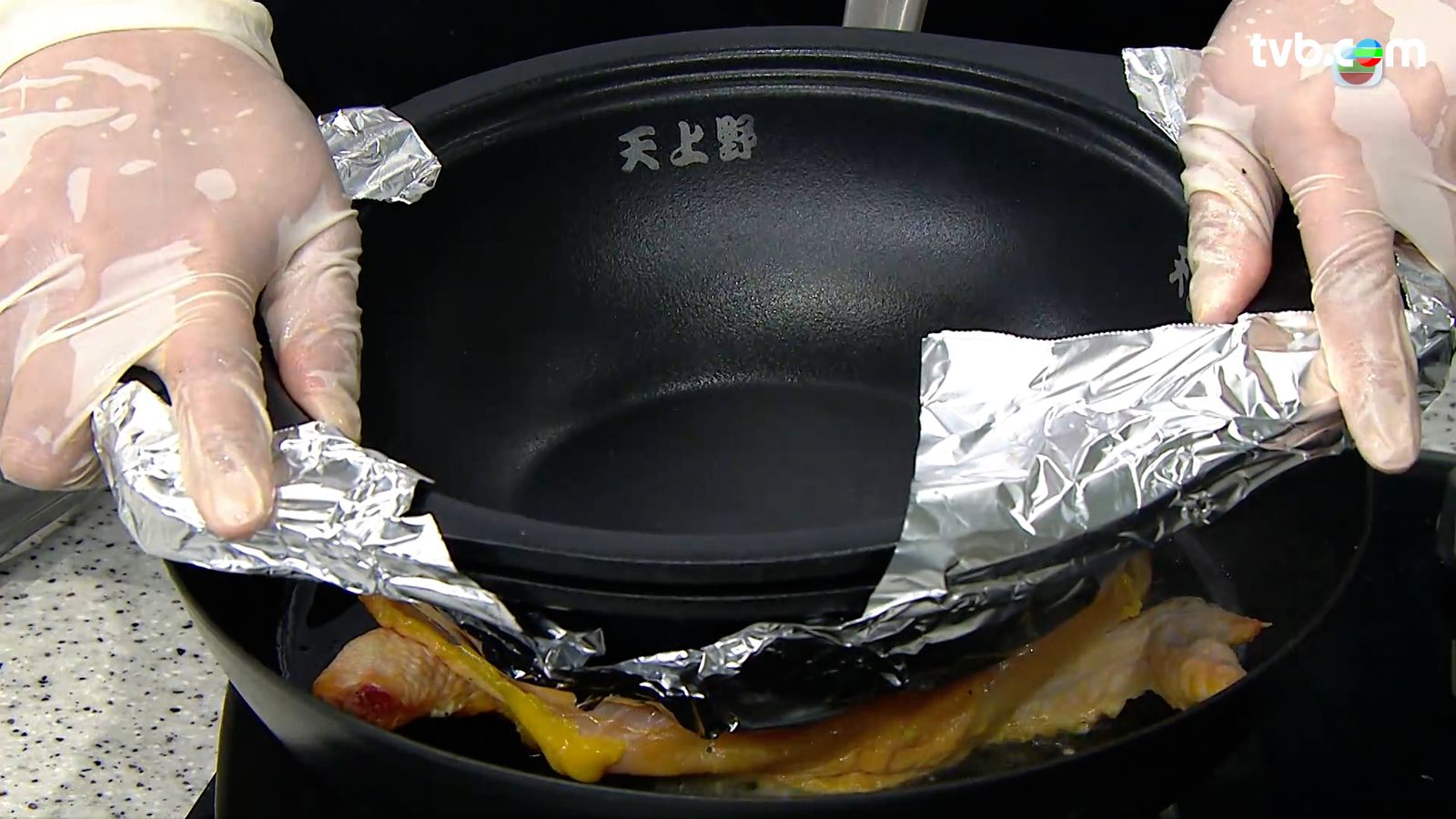 8.起油鍋,放入雞隻,先煎雞皮一面,期間用重物壓下雞隻。