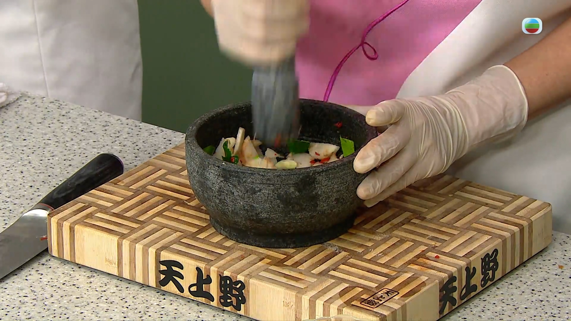 把香茅、南薑、指天椒、檸檬葉切碎,青檸榨汁,然後把香料碎倒入杵臼舂爛,能舂出和攪拌機截然不同的風味。再加入椰糖、魚露和青檸汁就完成底料了。將其分成一大一小兩份備用。