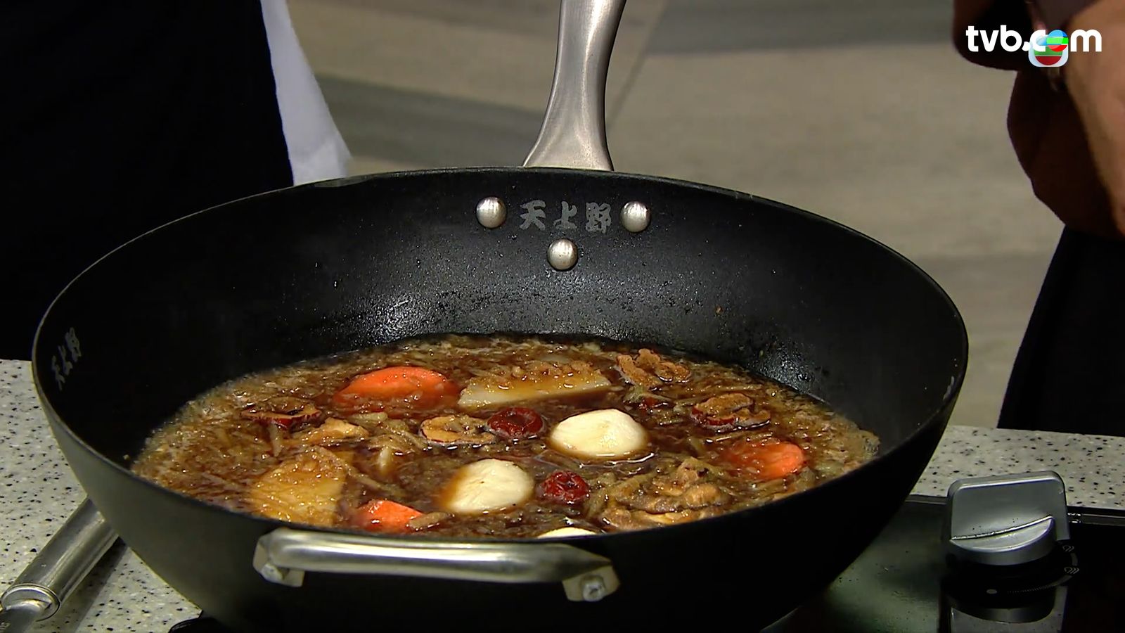 將醬油、黃糖、秋月梨蓉、味醂、清酒拌勻成調味醬備用。然後起油鍋,下洋蔥、蒜蓉、薑蓉、二荊條乾辣椒略炒,再加入調味醬、牛尾湯、冬菇、紅棗、甘筍、白蘿蔔、馬蹄,合蓋燜煮20分鐘。