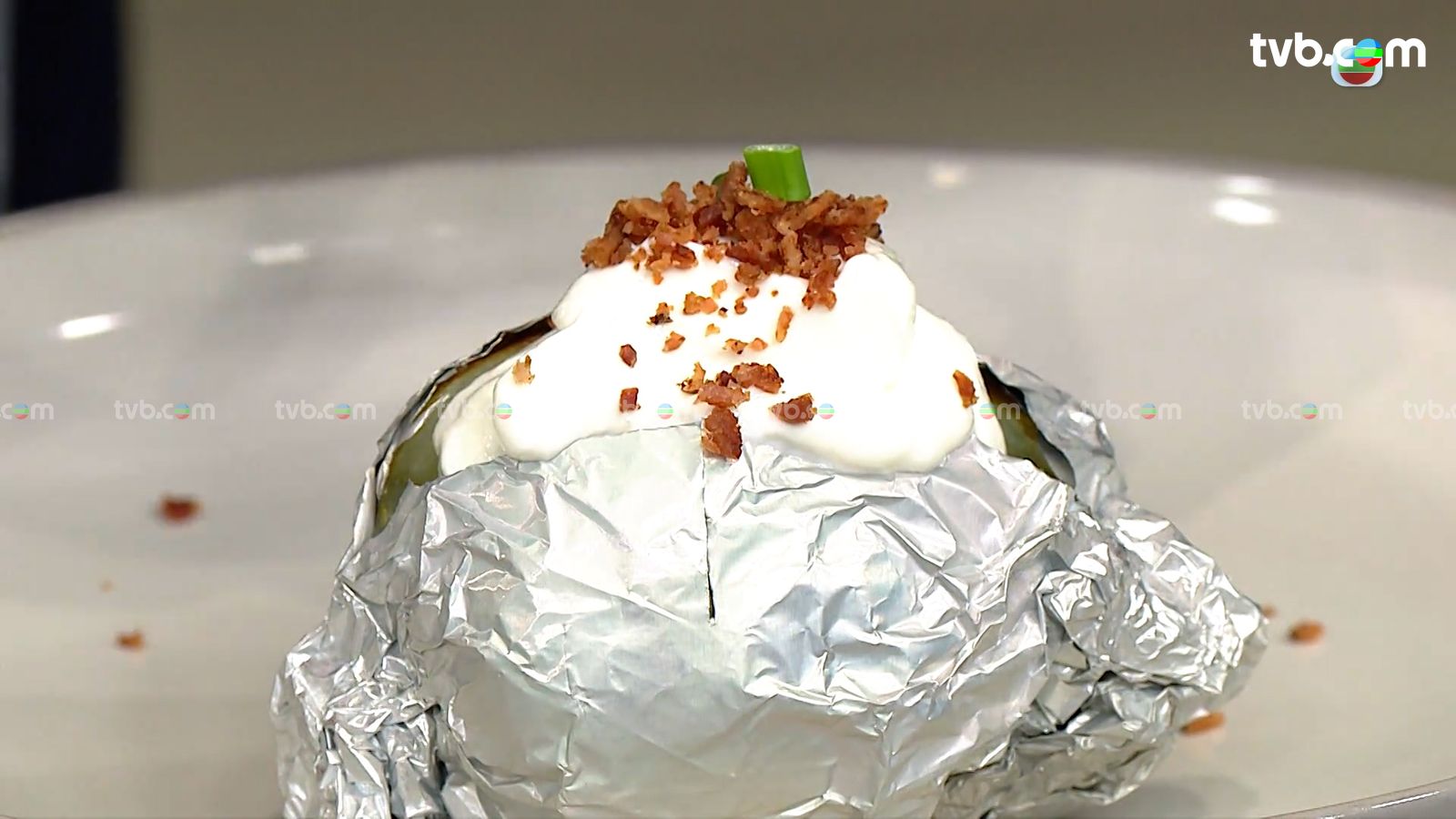 5.馬鈴薯用錫紙包裹,放入預熱至攝氏180度焗爐內焗約1小時至熟透,用刀在一面切十字,放上希臘式乳酪、煙肉碎、青蔥粒成焗薯仔。