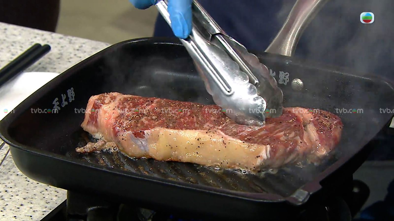 2.燒熱坑紋鍋,放上牛扒,以中火每面烤約4分鐘,取出,靜置10分鐘。