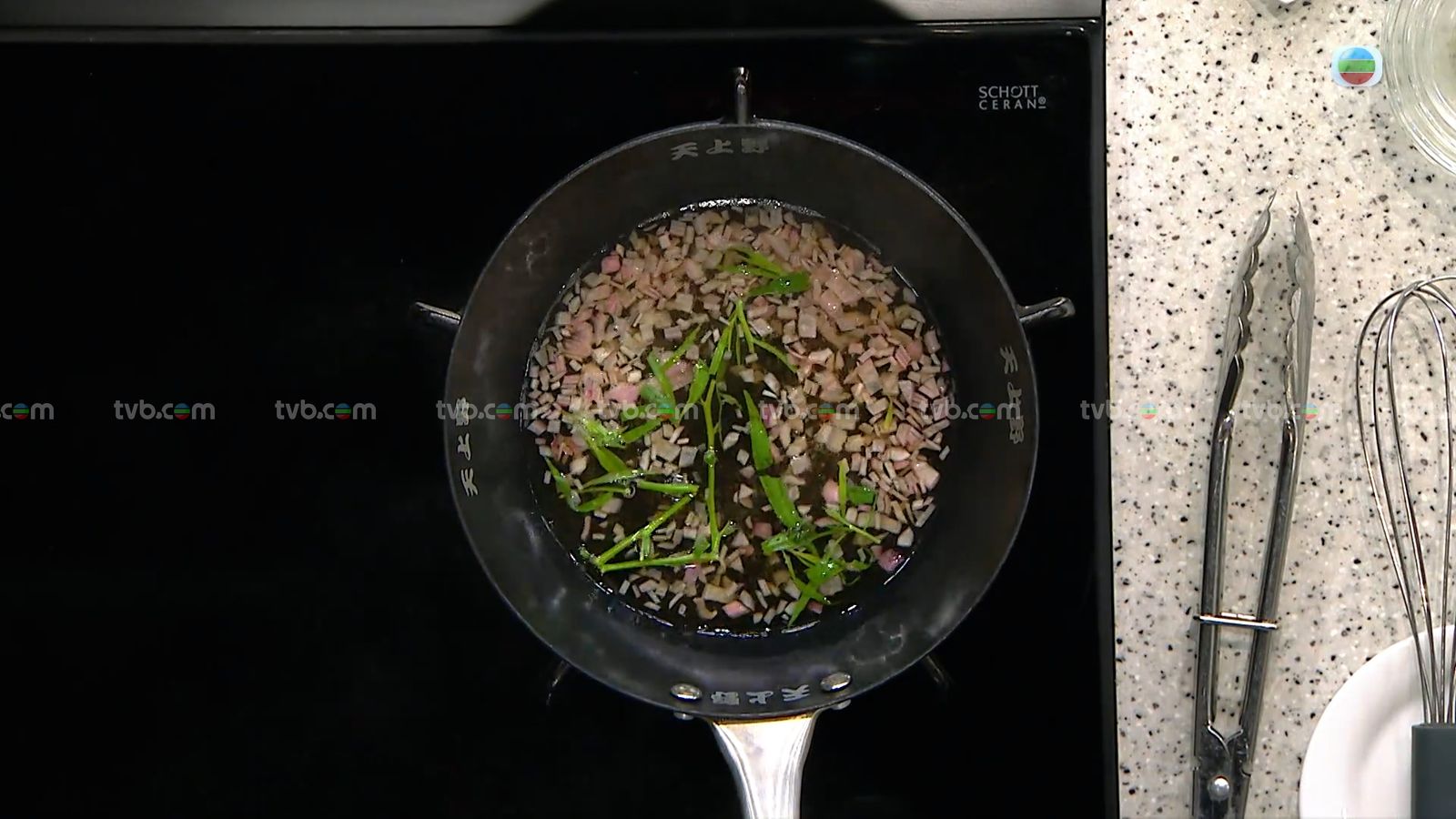 3.白酒醋、白葡萄酒、乾蔥碎及龍蒿草莖同放小鍋內,以慢火濃縮至剩餘約3湯匙汁液,隔去材料成賓士利汁。