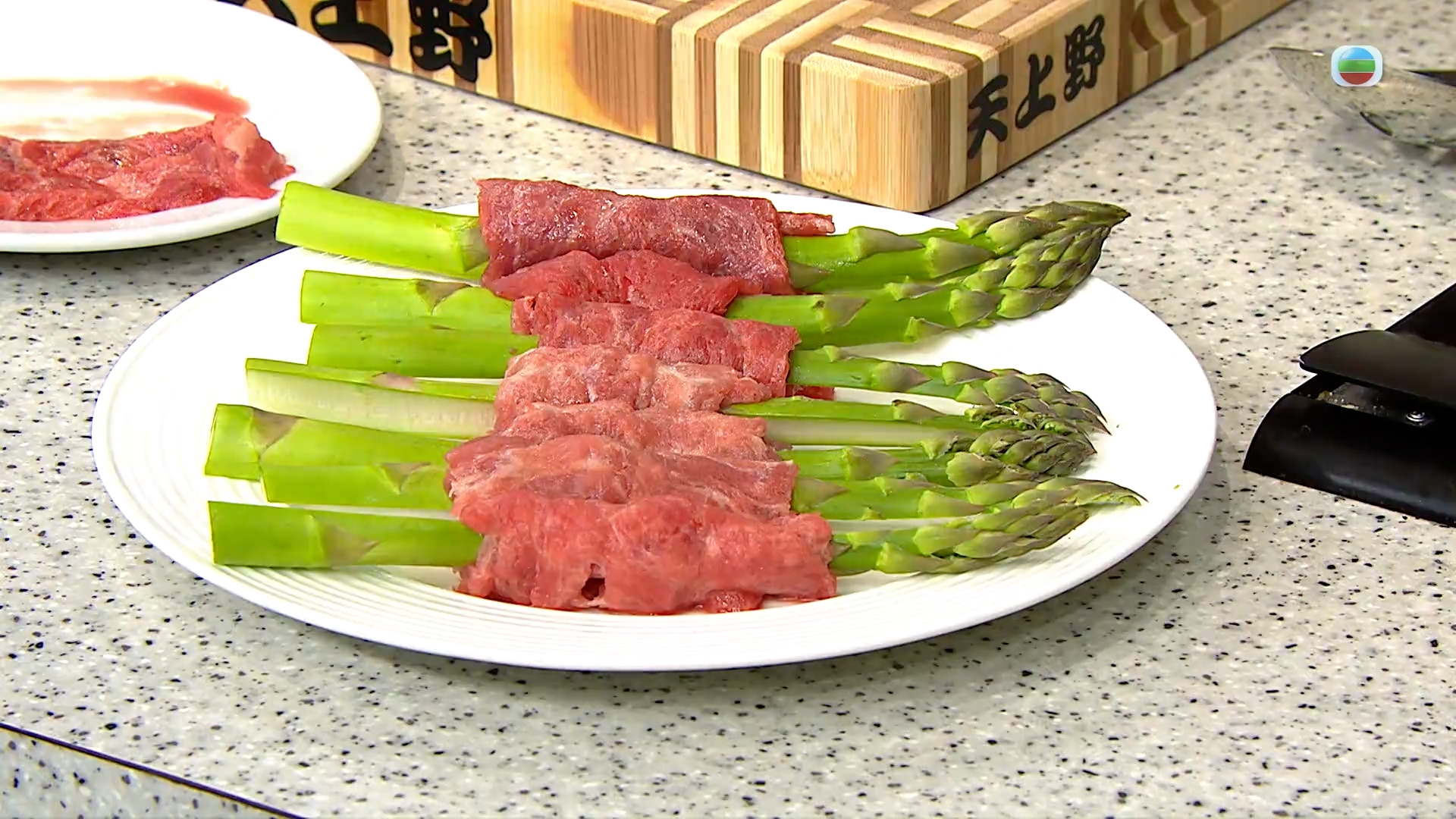 蘆筍開邊之後用鹽水煮一下,如果皮太厚的話可以適當削薄;牛肉方面,Leslie選用了西冷部份切片,再用肉錘或刀面將其拍成薄片,然後就可以包在蘆筍上面製成牛肉卷了。