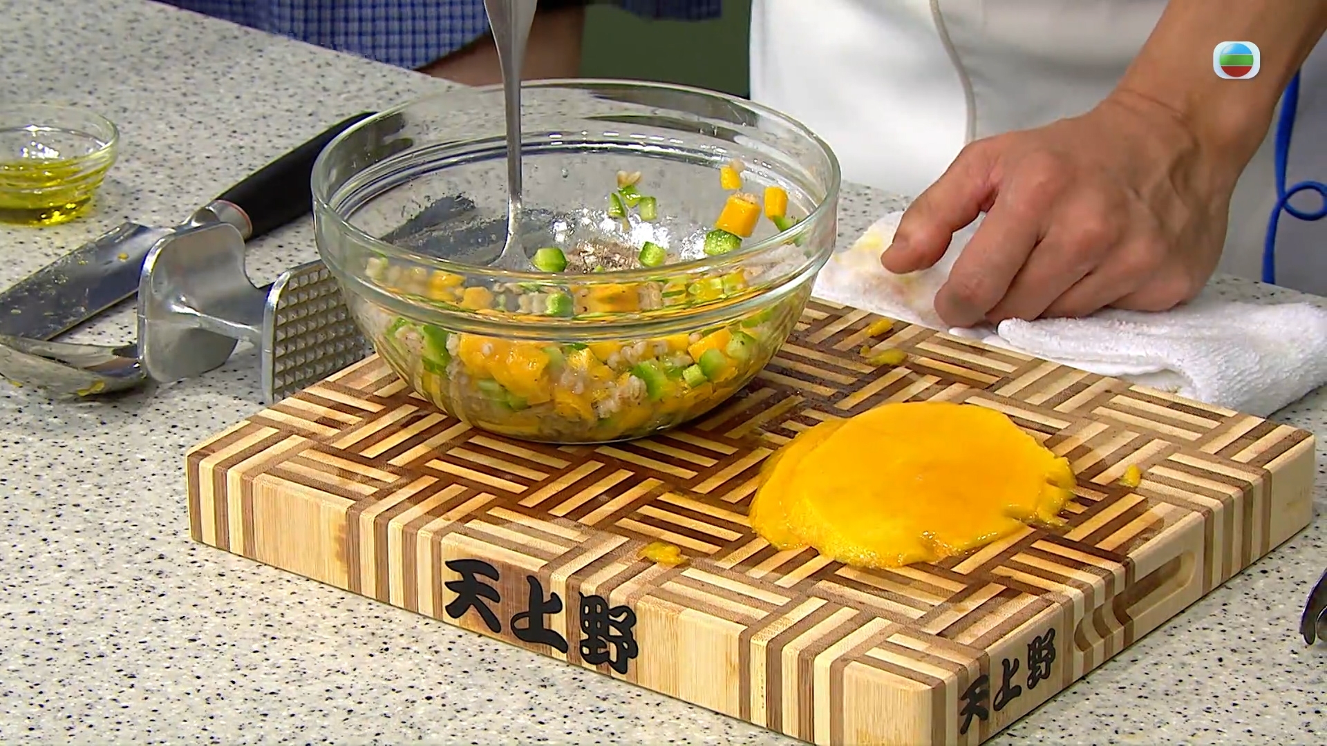 配料使用芒果、洋薏米、小黃瓜,和橄欖油、檸檬汁、鹽、黑胡椒等調料拌在一起,製成類似莎莎醬的樣子,洋薏米本身需要事先煮熟煮軟。