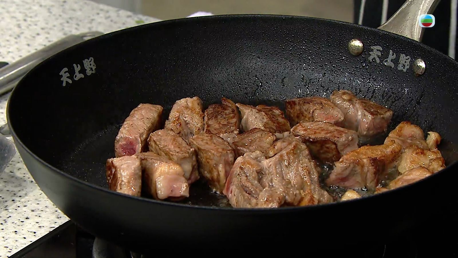 4.同一鑊內放入牛肉丁,煎至各面均勻地全熟,取出備用。