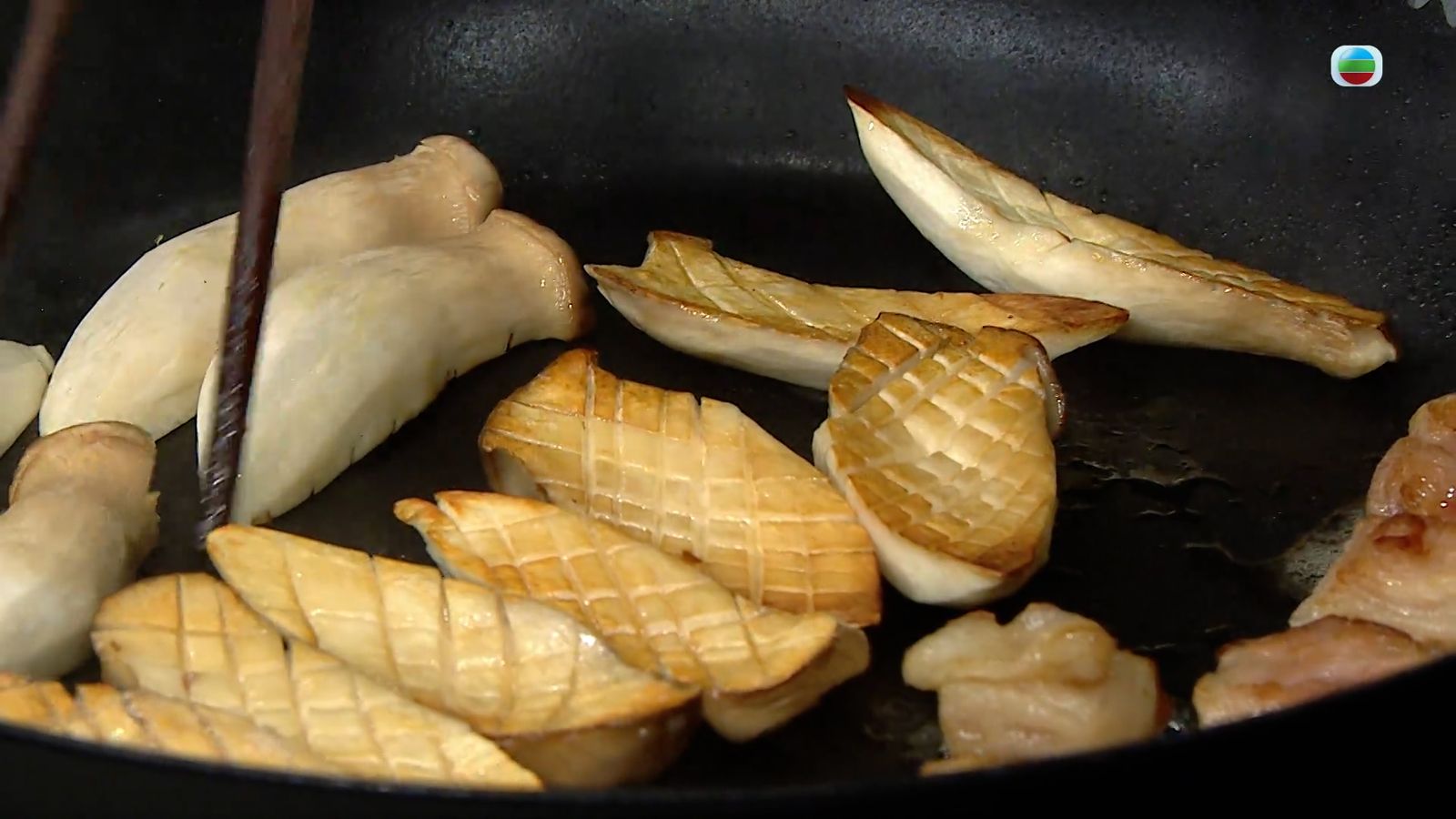 用牛扒脂肪部分起鑊,視鍋內乾澀狀況補上少許油,放入雞髀菇把有花紋一方煎至少許焦,撈起備用。
