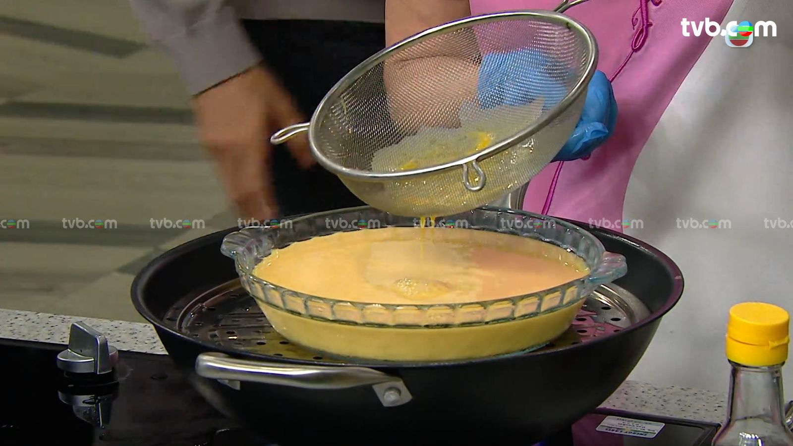 2.玉子豆腐材料拌勻隔濾,注入已預先蒸熱的深碟中,蓋上另一隻碟,隔水蒸至凝固成玉子豆腐。