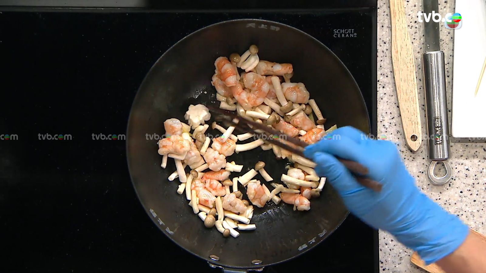 蝦仁預先去腸醃製好備用;芥蘭莖預先切粒汆水,下鹽、糖煮1分鐘後隔水備用。之後起油鍋,下蝦仁、薑、蒜蓉、鮮菇、芥蘭莖炒香炒勻。