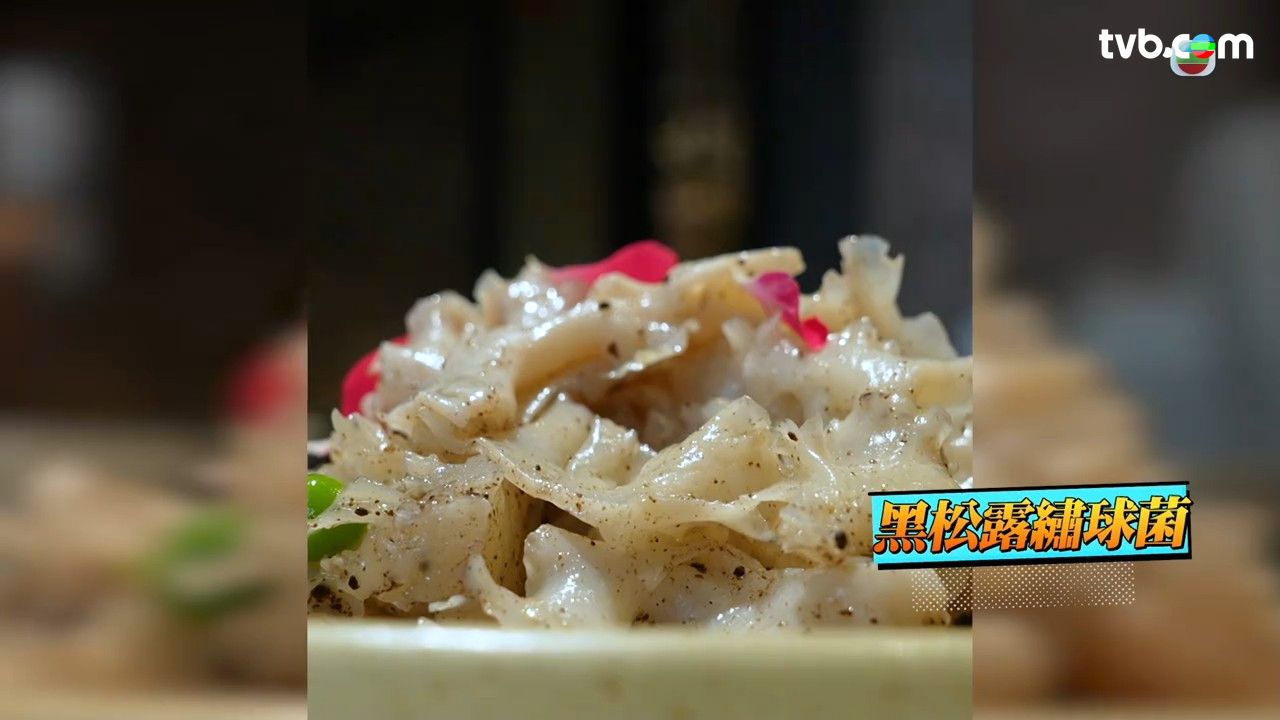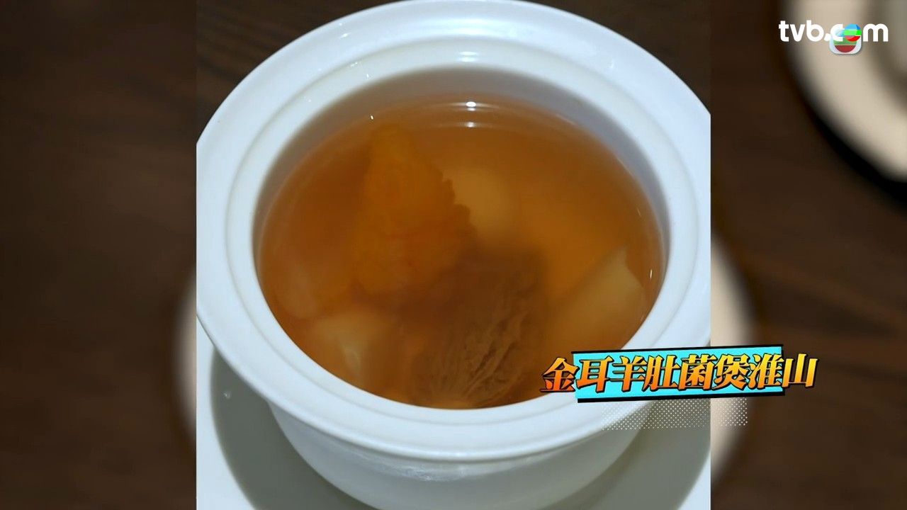 第一個介紹的菜式是金耳羊肚菌煲淮山,味道舒服,喝起來與平時有肉的湯沒有分別,讓吳業坤忍不住想整鍋喝掉。