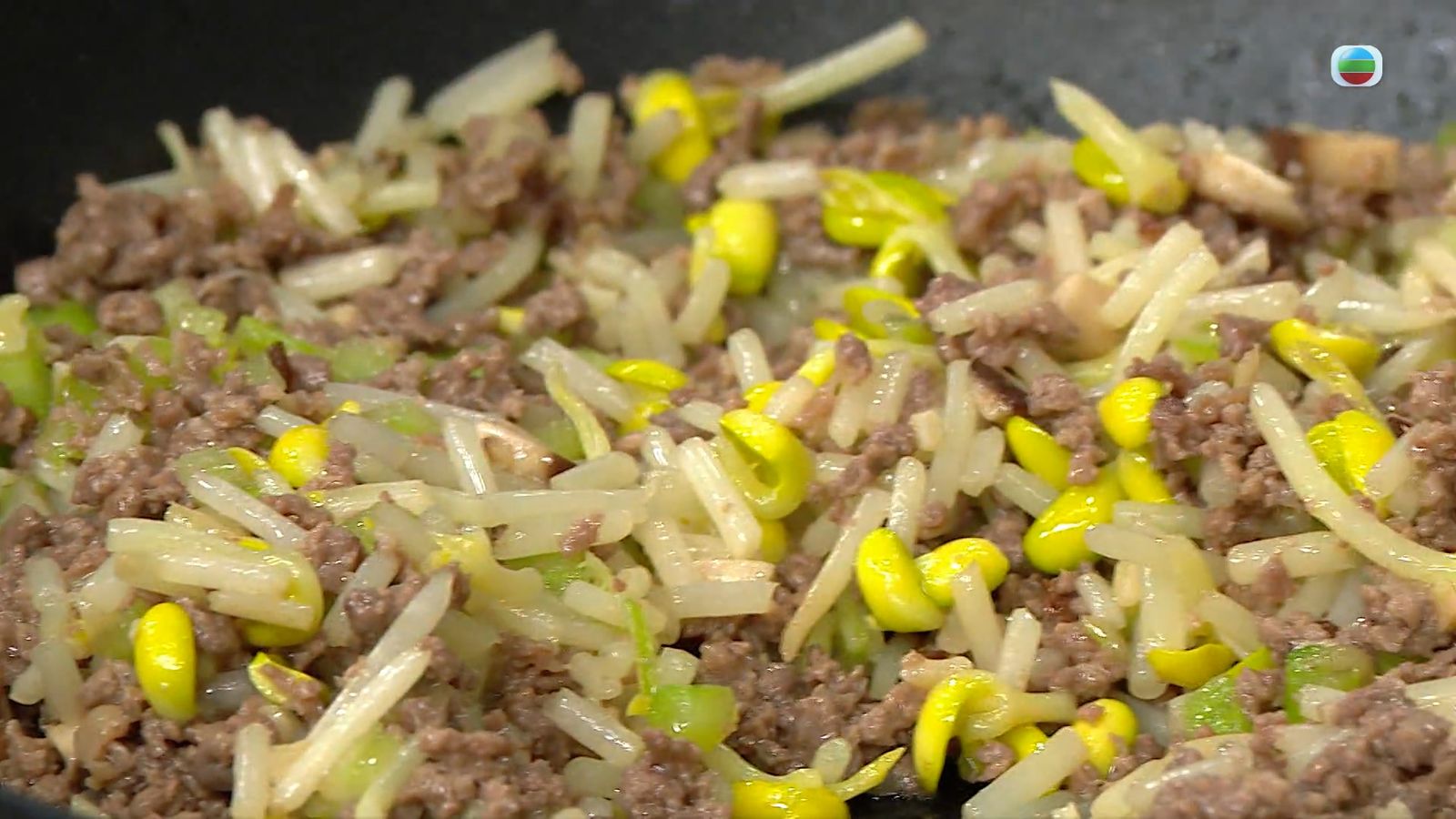 餡料由牛肉鬆、大豆芽以及西芹、鮮冬菇、甜椒等蔬菜組成。牛肉鬆拌入豉油和粟粉後炒熟備用;大豆芽切粒炒香備用,要和牛肉鬆分開炒。其他蔬菜切粒即可。