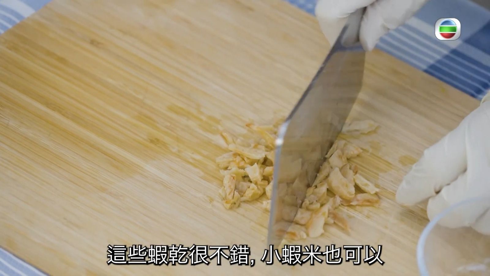 - 先把蝦乾浸掉,再切成細小塊,把油、蝦乾加到煲上,燒得要夠熱,之後加上蒜蓉、蔥頭與指天椒。