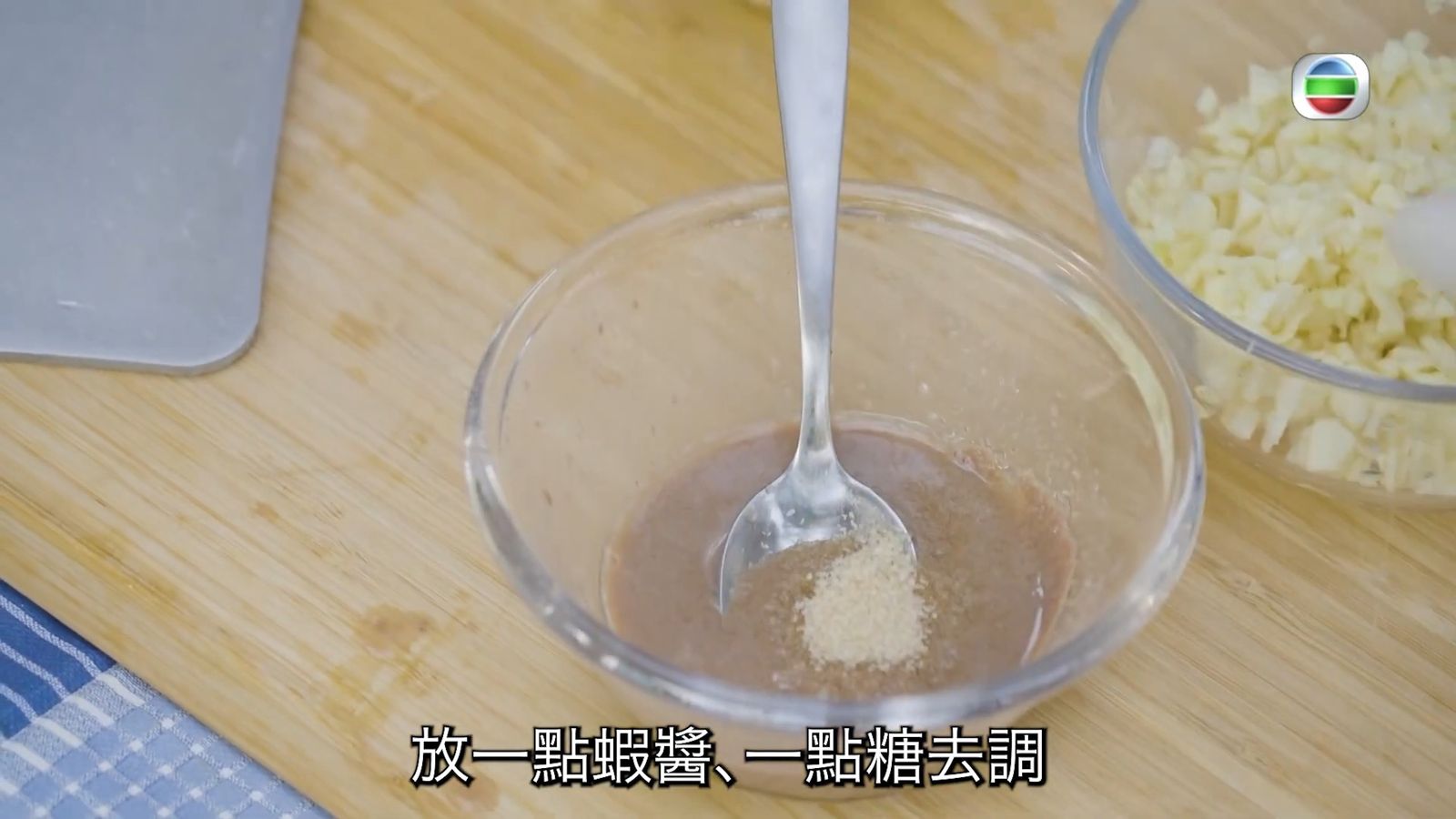 - 處理蝦醬時加上紹興酒、糖,然後攪拌調稀,加入煲上,繼續爆香。