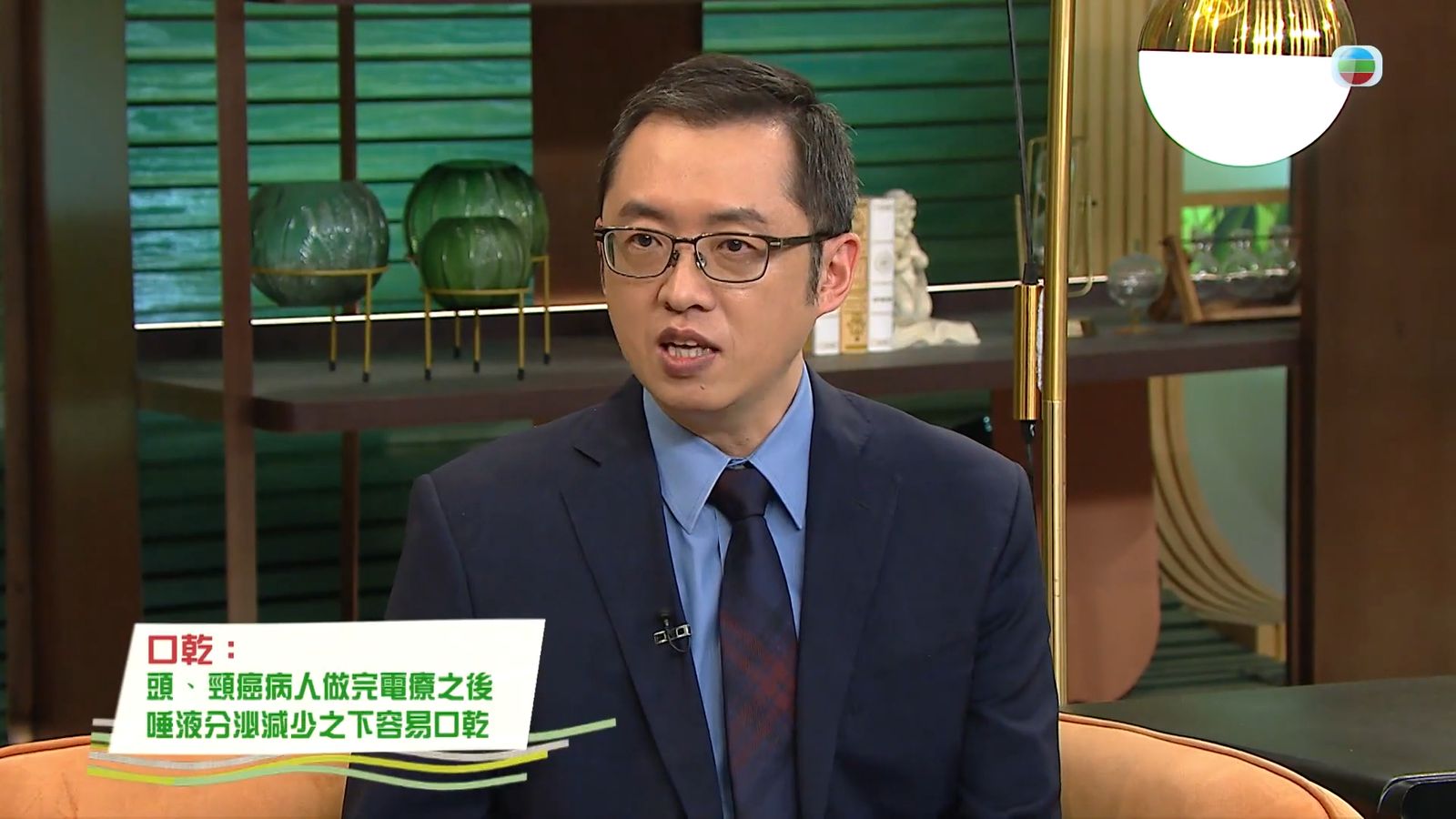 頭、頸癌病人做完電療之後,唾液分泌減少之下容易口乾,在冬天乾燥情況下,感覺會更嚴重。醫生會建議病人多飲用液體,外出時帶暖水,口乾時補充水分;進食時不要吃太乾的食物。