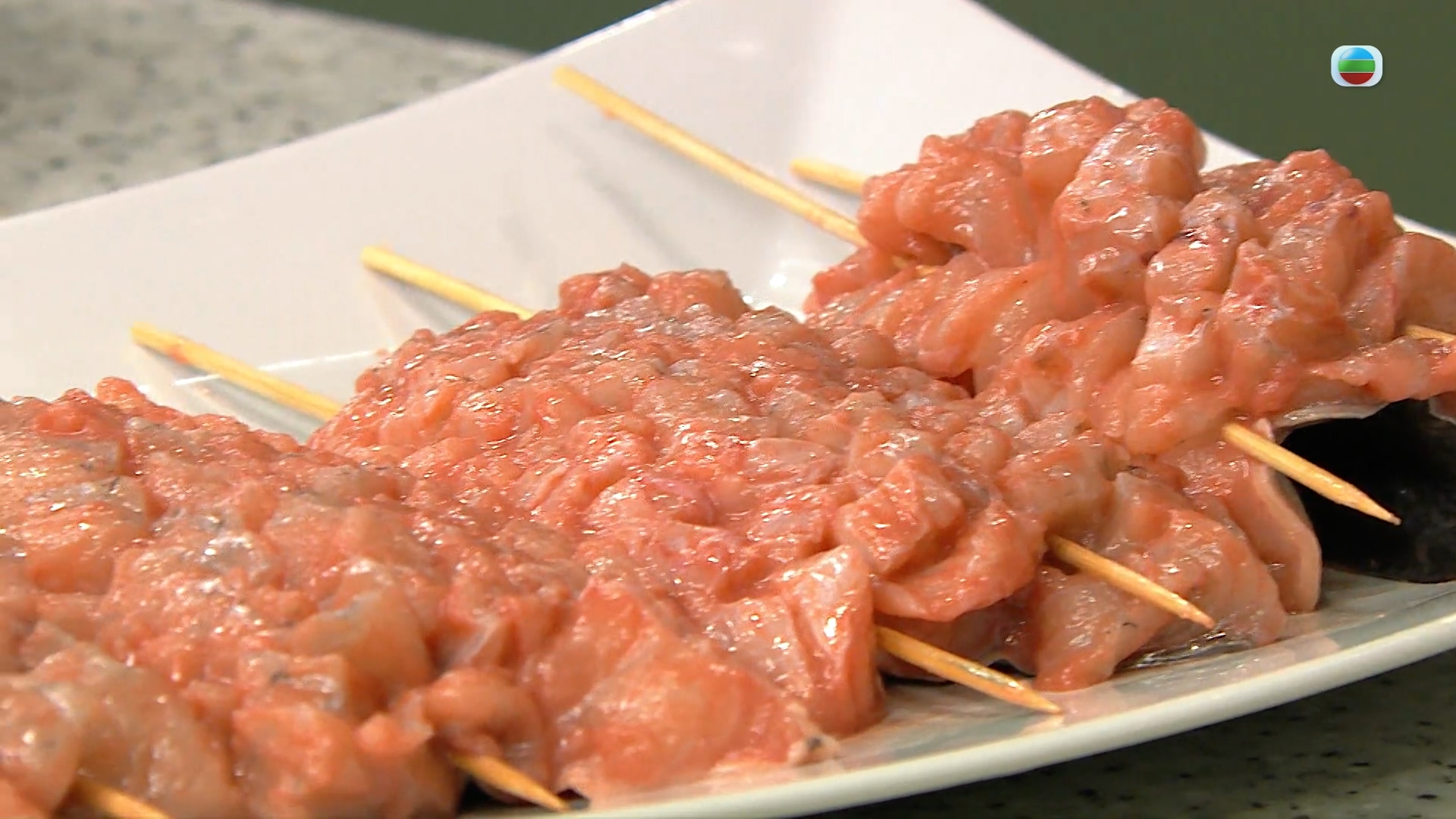 2.加入三茶匙南乳醬、少量糖、味粉、玫瑰露酒,然後用竹籤串起醃15分鐘。
