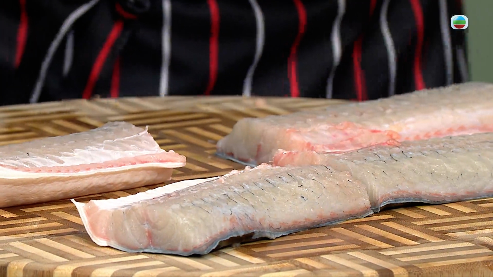 1.把頭尾切去,在背部貼住骨的位置切開起骨,一開為二。