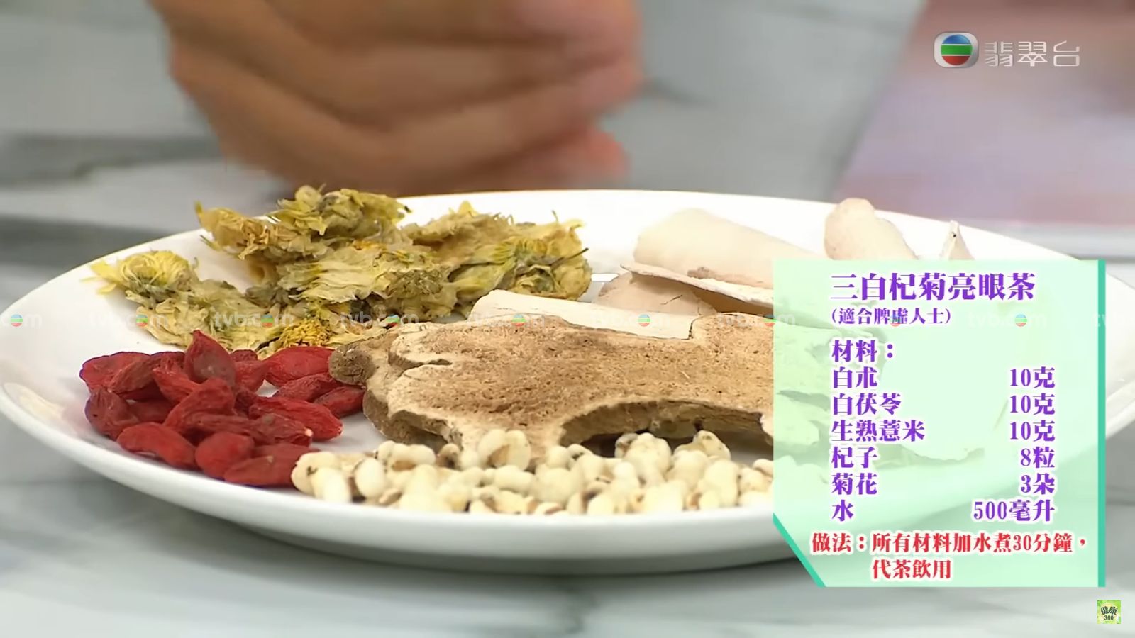 材料:白朮 10克、白茯苓10克、生熟薏米 10克、杞子 8粒、菊花 3朵、水 500毫升