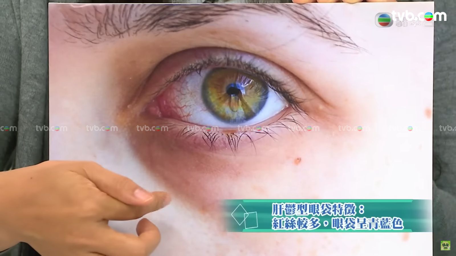 肝鬱型眼袋特徵為紅絲較多,眼袋呈青藍色;體現在身體上則有情緒易波動、容易有痛症、大便不調等情況。