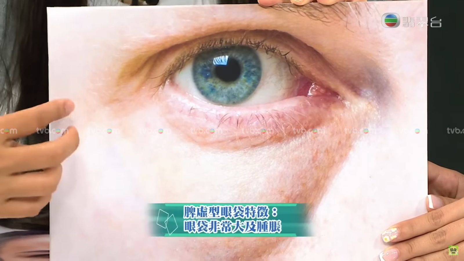 倪詠梅醫師介紹,從中醫角度來講,眼睛不同的位置對應不同的臟腑。脾虛型眼袋特徵為眼袋非常大及腫脹,擁有脾虛型眼袋的人士一般水分代謝較差,眼窩容易積聚水分;脾虛則反映在身體上則體現為脾胃功能差,容易胃痛,消化不良等;喜愛生冷食物、暴飲暴食以及不良飲食習慣等原因都有可能導致脾虛。