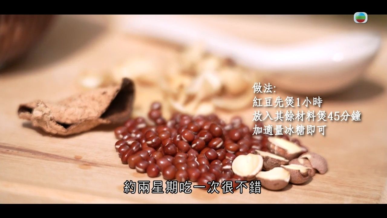 做法:紅豆先煲1小時,之後放入其餘材料煲45分鐘,加適量冰糖即可。