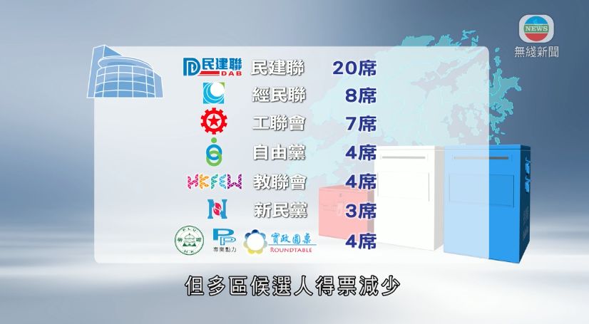 民建聯共取得20席,較現屆多一席,繼續蟬聯立法會最大黨,但多區候選人得票減少。經民聯及工聯會分別有八席及七席,新民黨議席就減半至三席。