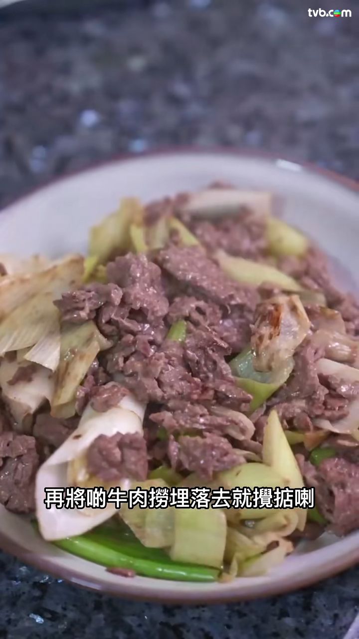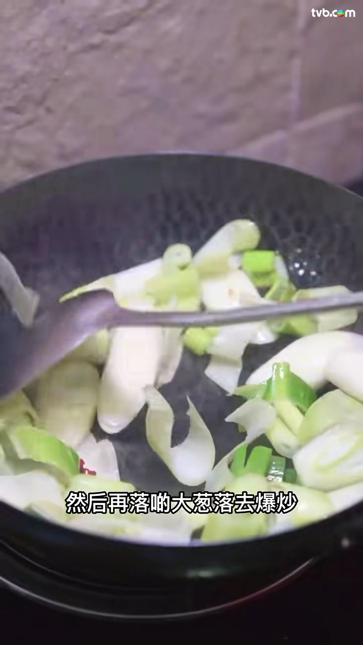- 抽起牛肉,把大蔥倒進鑊中爆炒;之後先再倒進牛肉一齊炒。