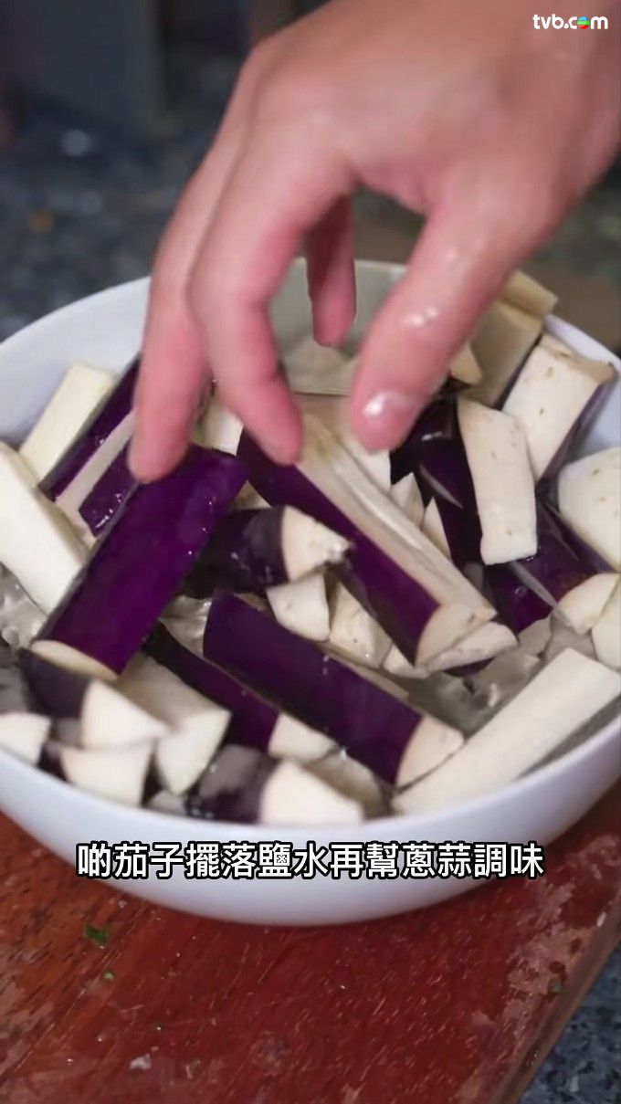- 把切碎的茄子放進鹽水內。
