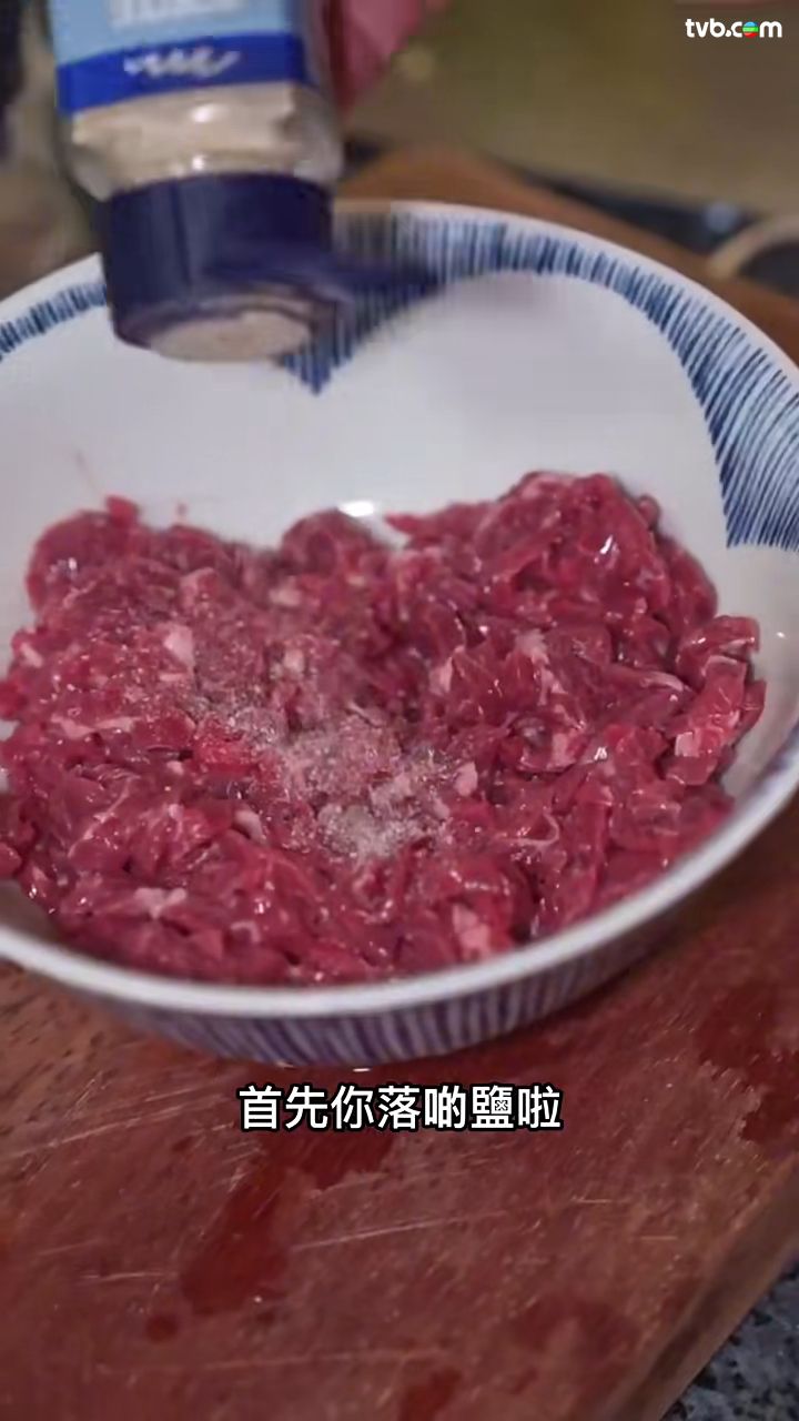 - 把食用鹽、胡椒粉、即磨黑椒、食用糖、雞粉、蠔油、食用油、紹興油、蛋白和生粉,灑在生牛肉上,並且撈勻醃製。