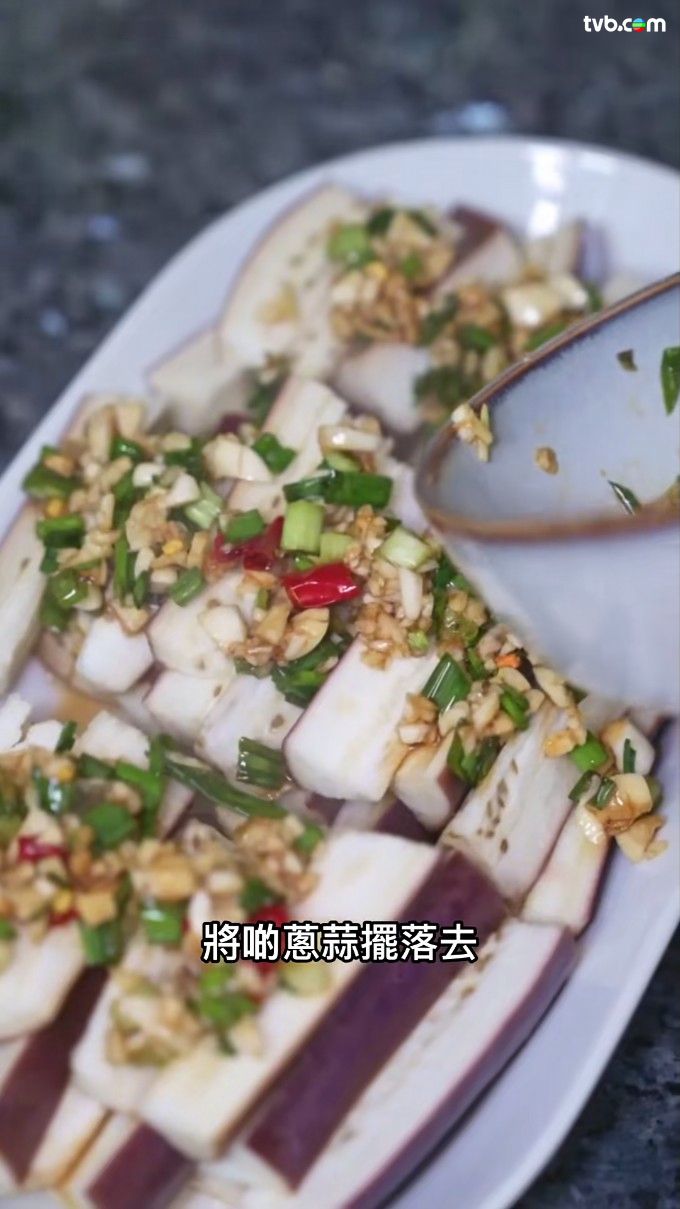 - 把調製成的醬汁、滾油,淋在蒸好的茄子上,完成!