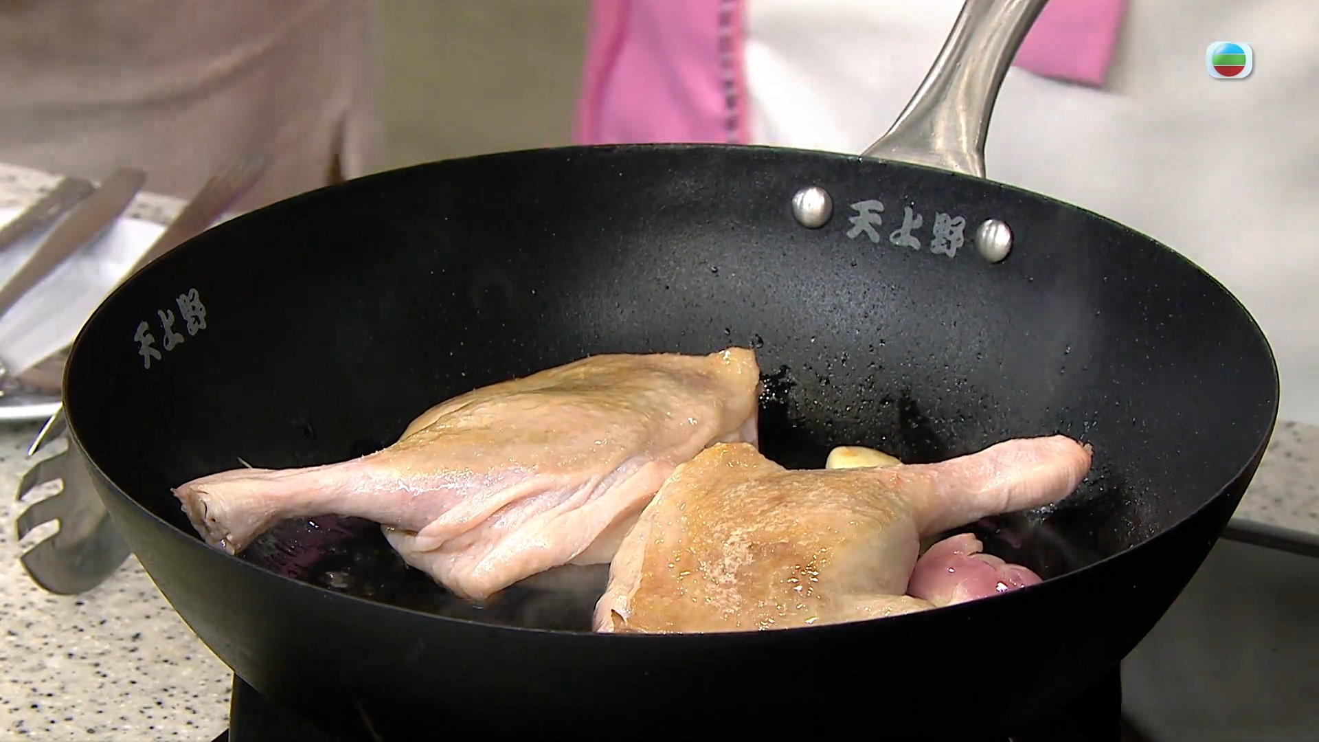 鴨髀本身不需要事先調味,解凍抹乾之後就可以直接下鑊煎,只要先煎有皮的那一面就能煎出鴨油,所以不需要下油就能煎。煎出鴨油之後就能下乾蔥、蒜頭一起爆香。
