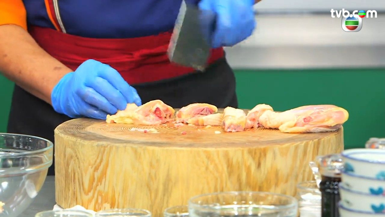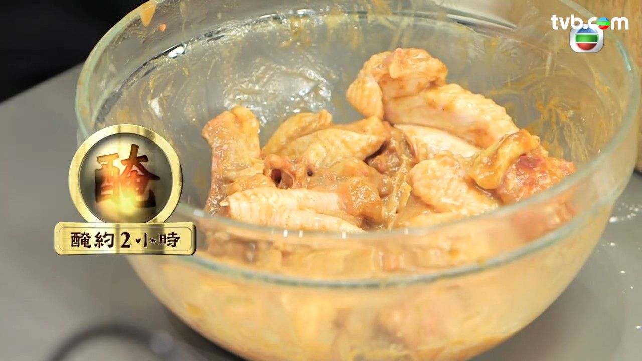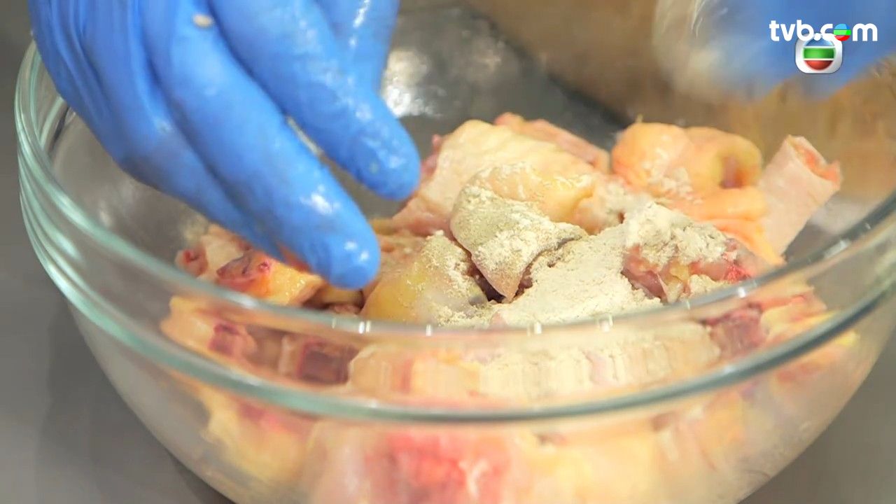 - 鮮雞斬件後,用薑汁、酒、沙薑粉、胡椒粉拌好後,才加入五香粉、蠔油、麻油,最後加入生粉及水,醃約2小時