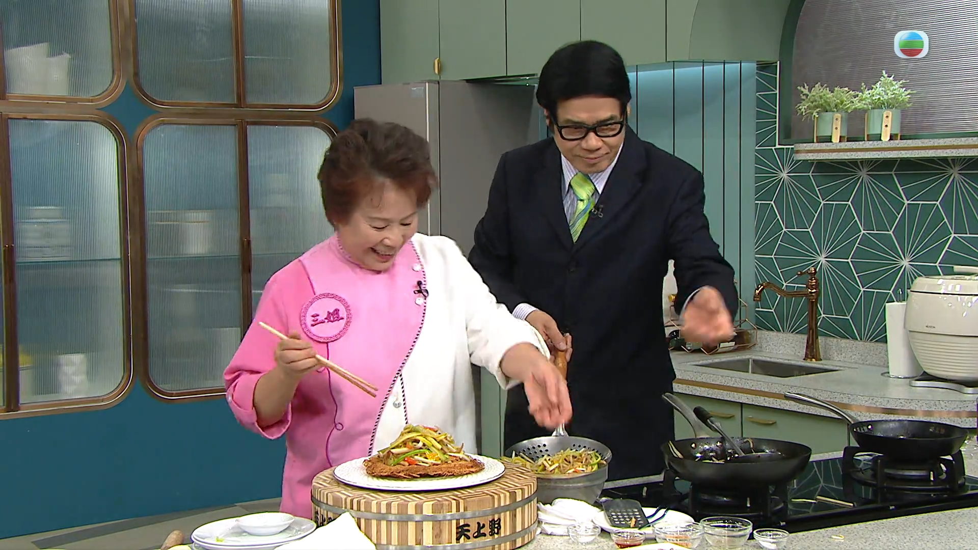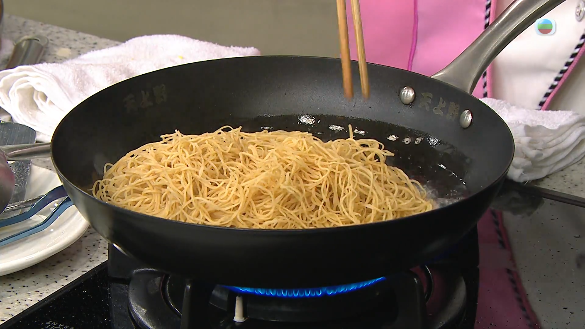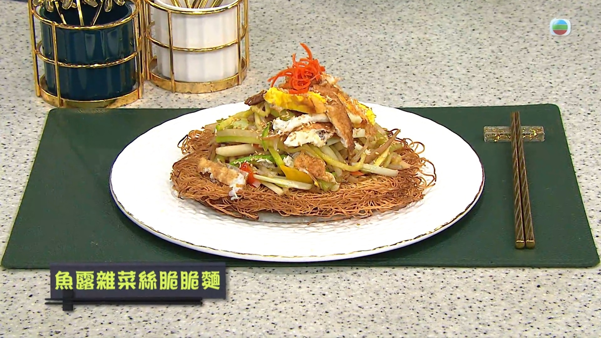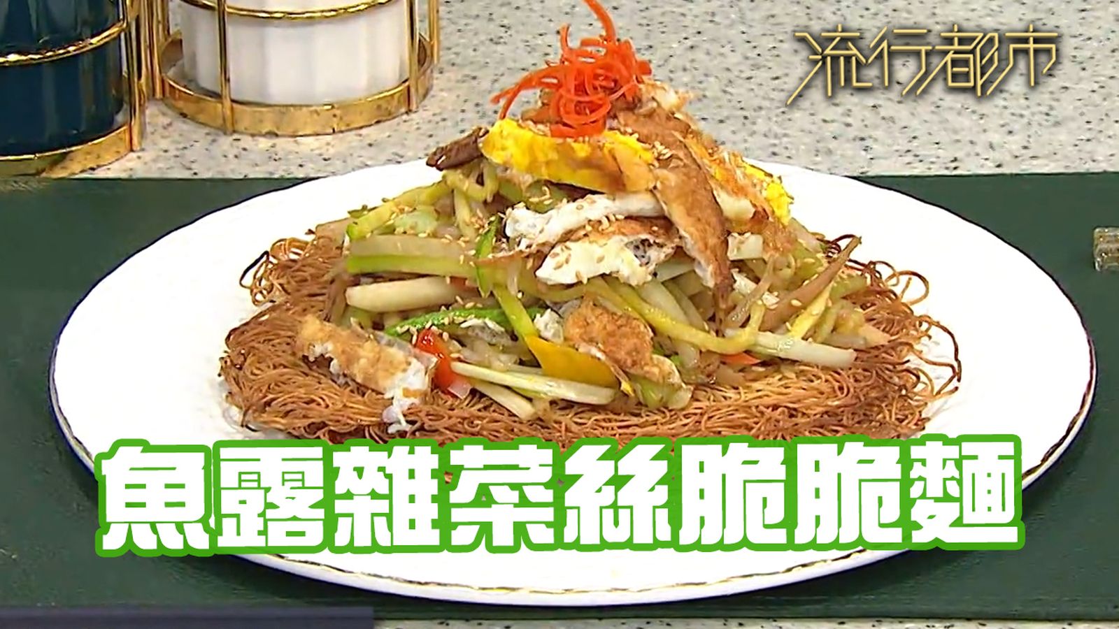 今集《流行都市》「睇餸食飯」環節有三姐蕭秀香教大家煮香脆可口的「魚露雜菜絲脆脆麵」