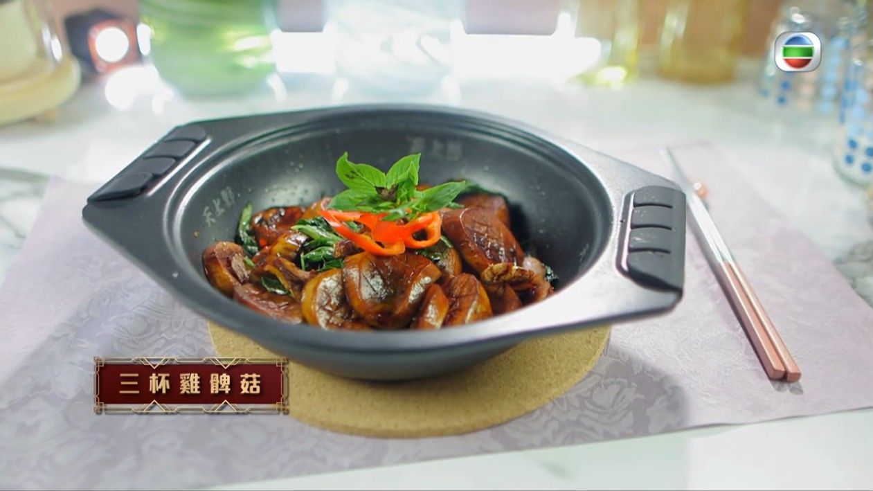 蕭秀香(三姐)、江美儀(美儀)主持的《女人必學100道菜》中,美儀曾教大家煮三杯雞髀菇,愛吃素食的人必一定要試試!