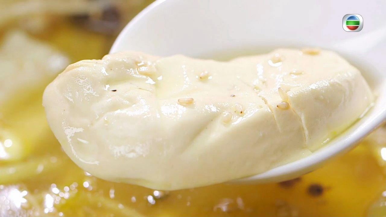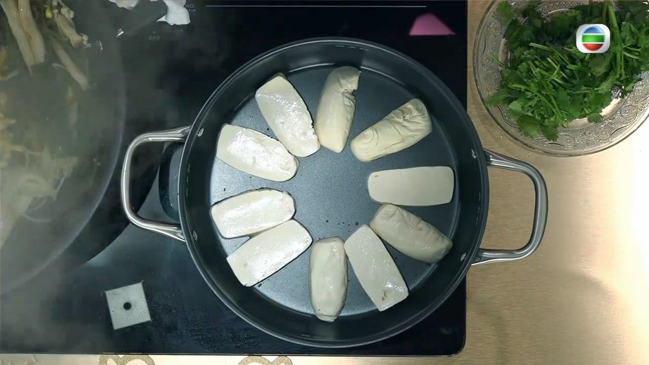 - 在另一鍋中,先鋪上布豆腐,把(6)倒入,開火慢煮,放入素白帶魚、(7)、素魚露及炒過的芝麻