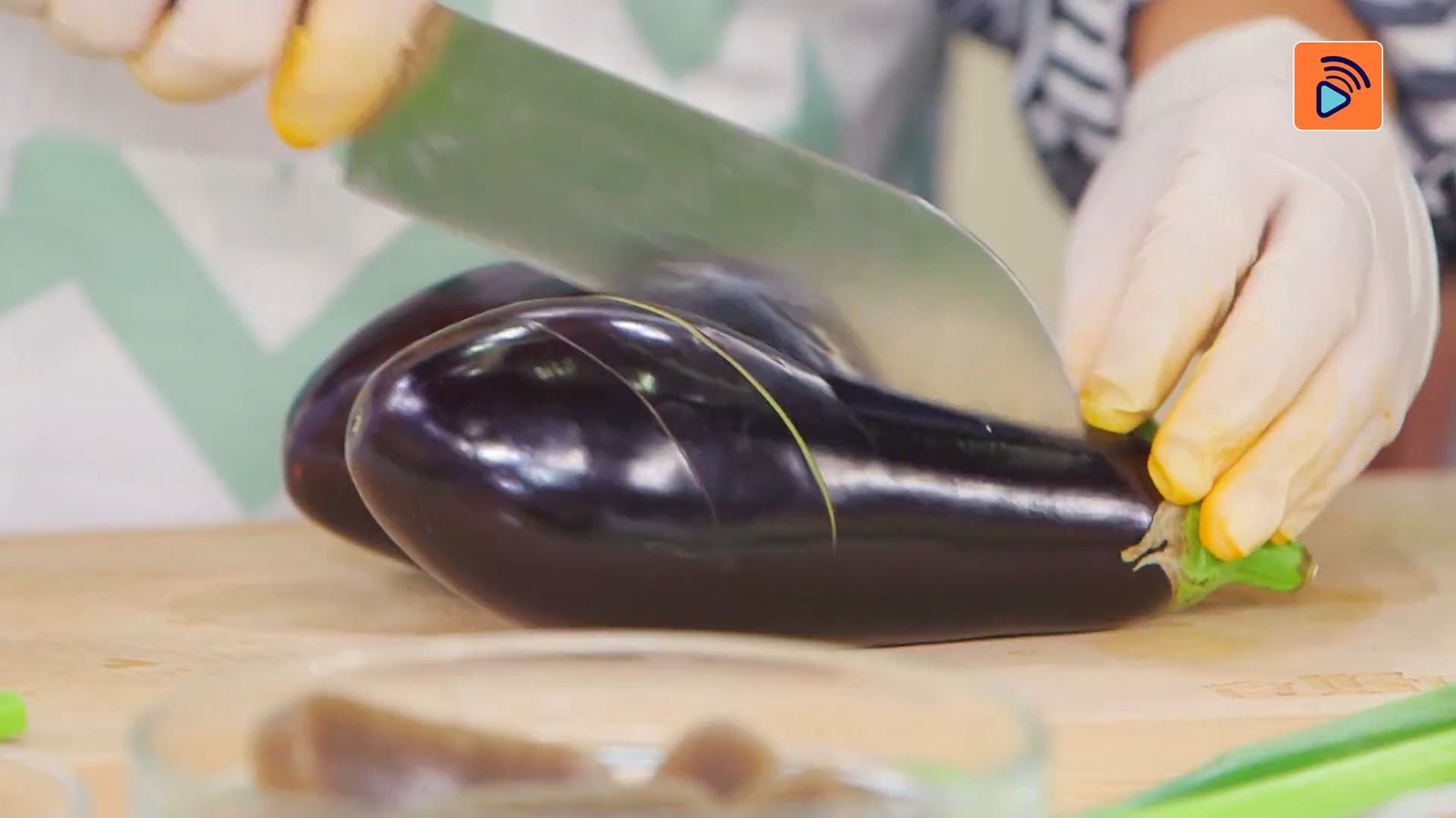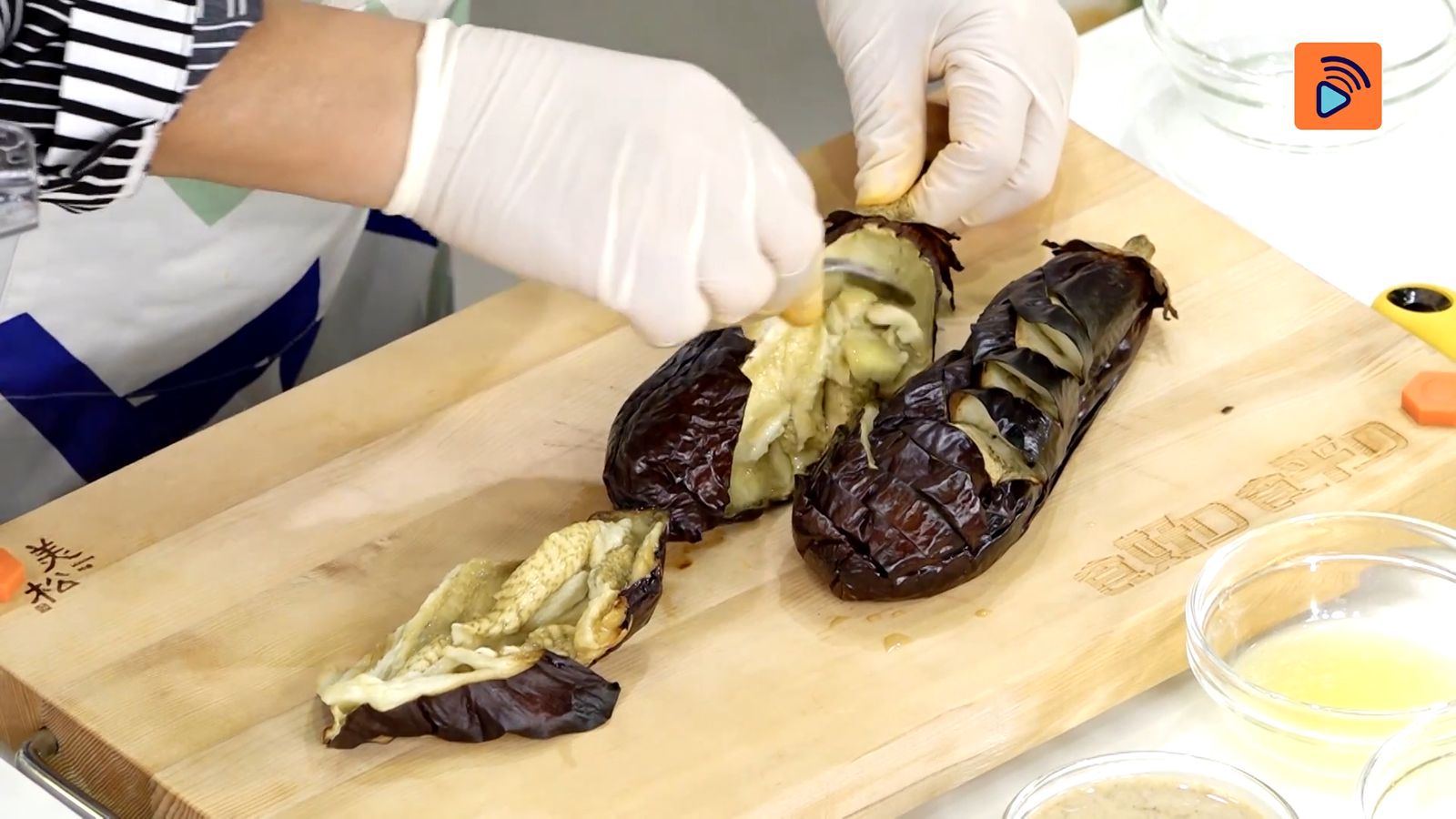 - 茄子用刀劃數下,用焗爐以230°C-250°焗約30分鐘,完成後去皮起肉