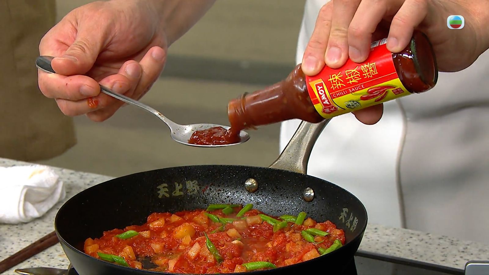 醬汁以蕃茄肉打底,加入李子碎、法邊豆和辣椒醬煮至濃稠,最後澆上少許橄欖油就完成了。