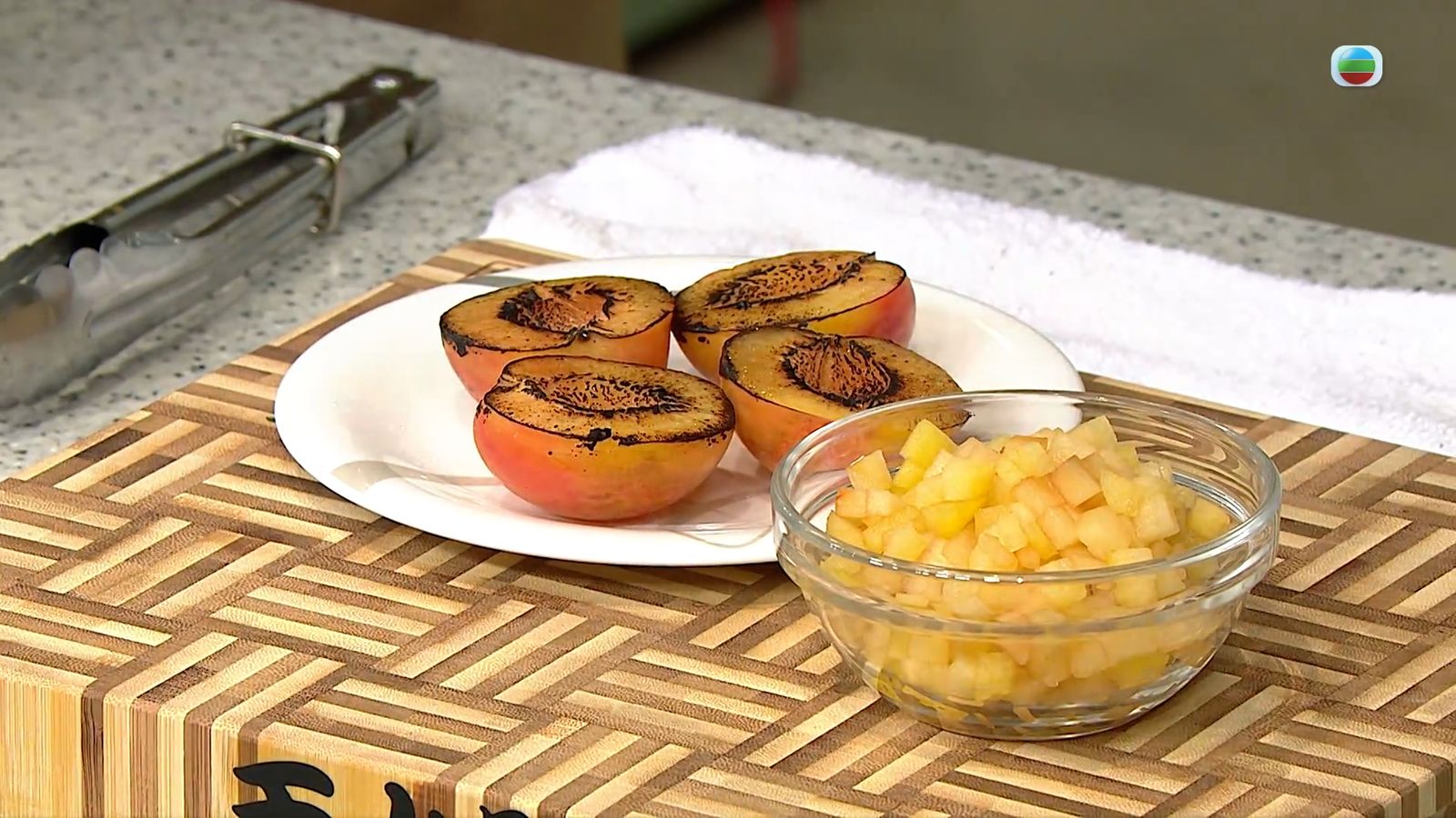 恐龍蛋是一種跟李子近似的水果,含有豐富的水溶性纖維及果膠。恐龍蛋對半切開並去核之後煎香表面備用。另外切碎一些李子用於煮醬汁之用。