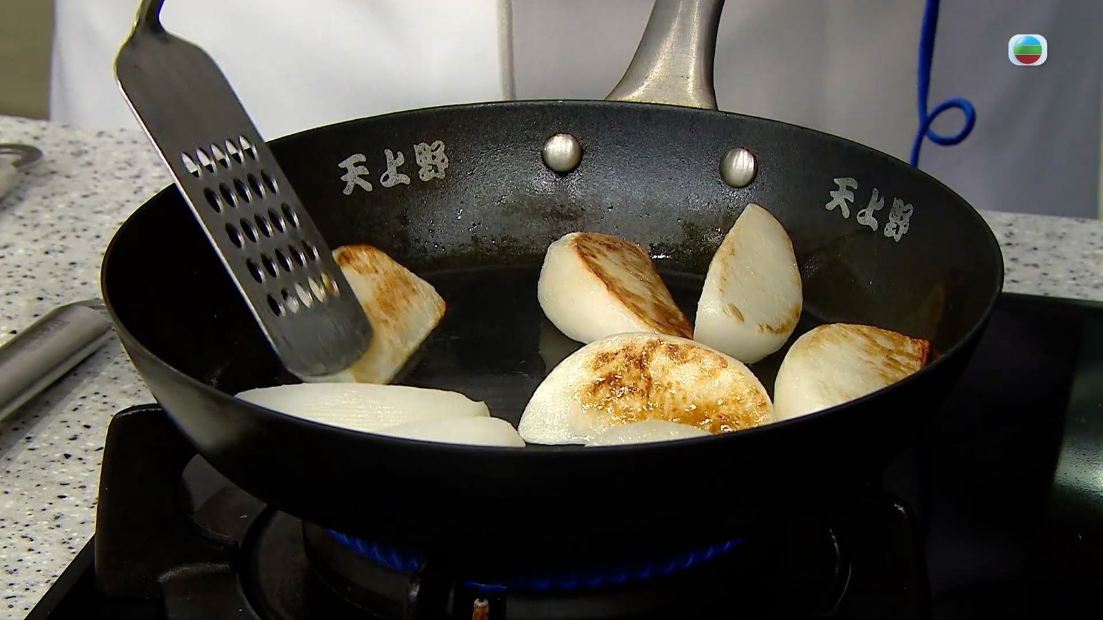 4.蘿蔔預先蒸5分鐘再放涼,然後放入油鍋上煎封兩面。