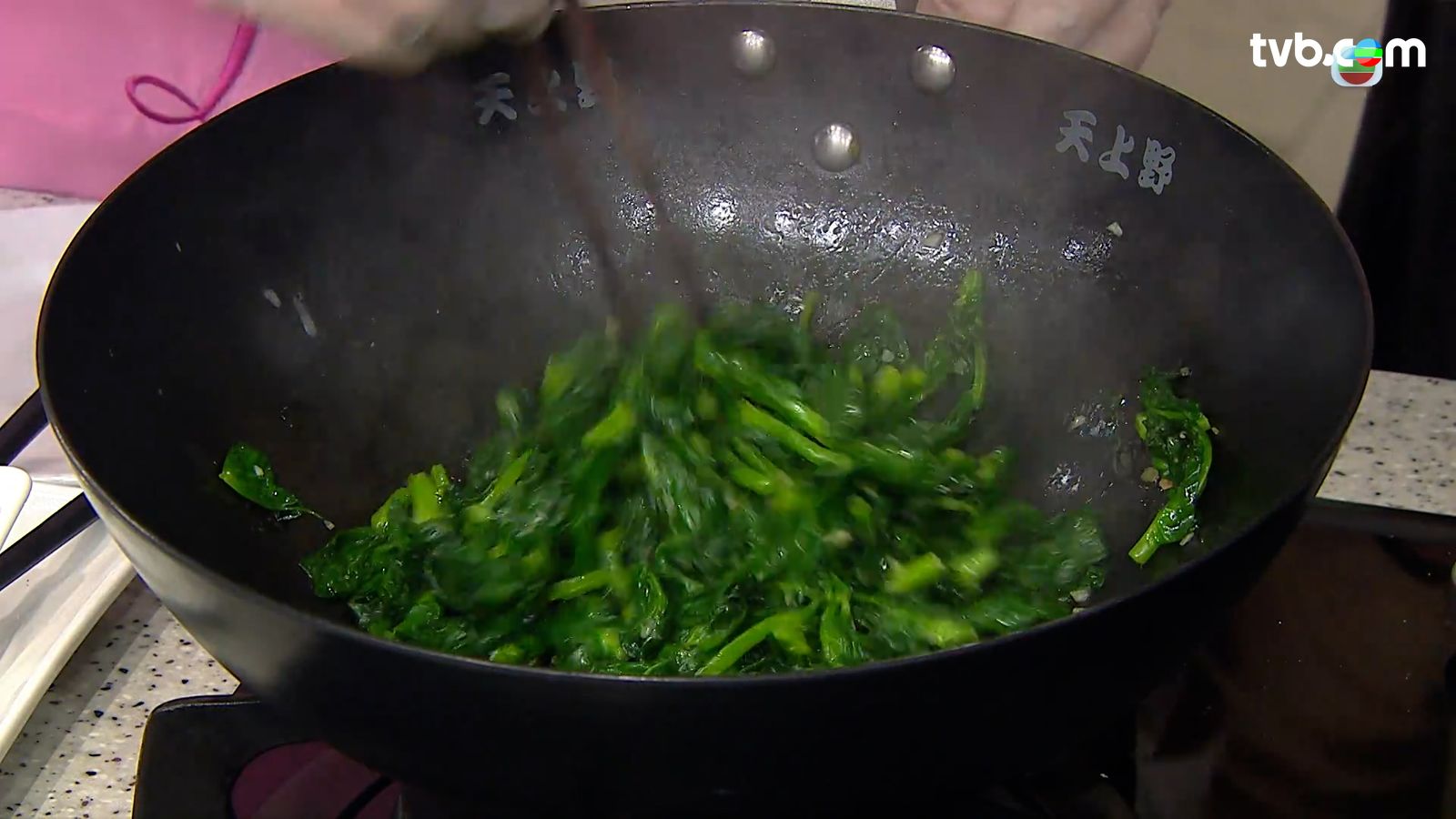 另起油鍋,下蒜蓉起鍋,加入拌有鹽、糖的清水,再下豆苗炒香,最後注入生粉水勾芡成炒豆苗。