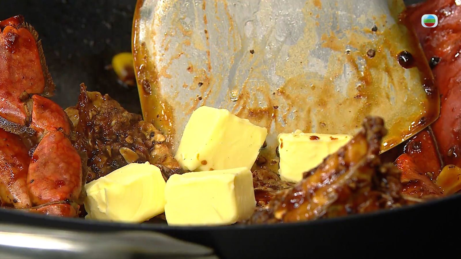 把蟹件下鍋煎香,灑入黑白胡椒爆香,倒入雞湯和蠔油、生抽、老抽後加上粟米粒煮至收汁,再加牛油和青紅椒粒拌勻。牛油最好從雪櫃拿出來直接下鍋,溶化後就會有類似打芡的效果。