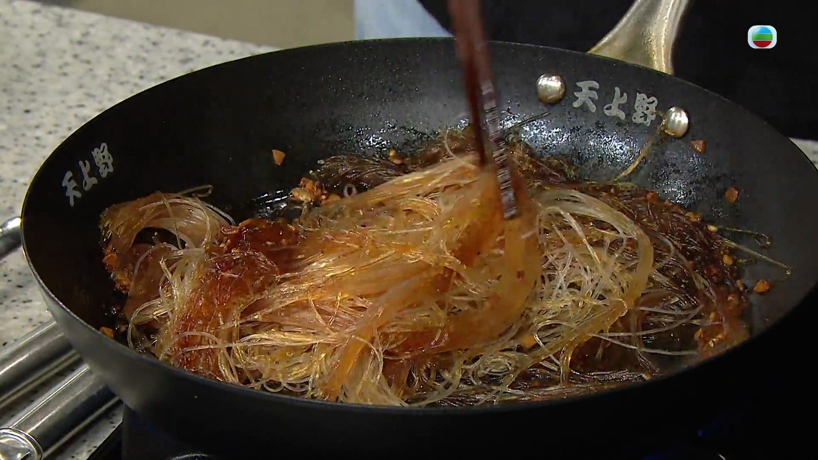 之後處理粉絲,爆香蒜蓉之後下黑白胡椒碎、大地魚粉、雞湯、蠔油、生抽、老抽稍煮,然後下事先浸好的粉絲炒香備用。黑白胡椒在下鍋前才磨碎,以保留最多的風味。