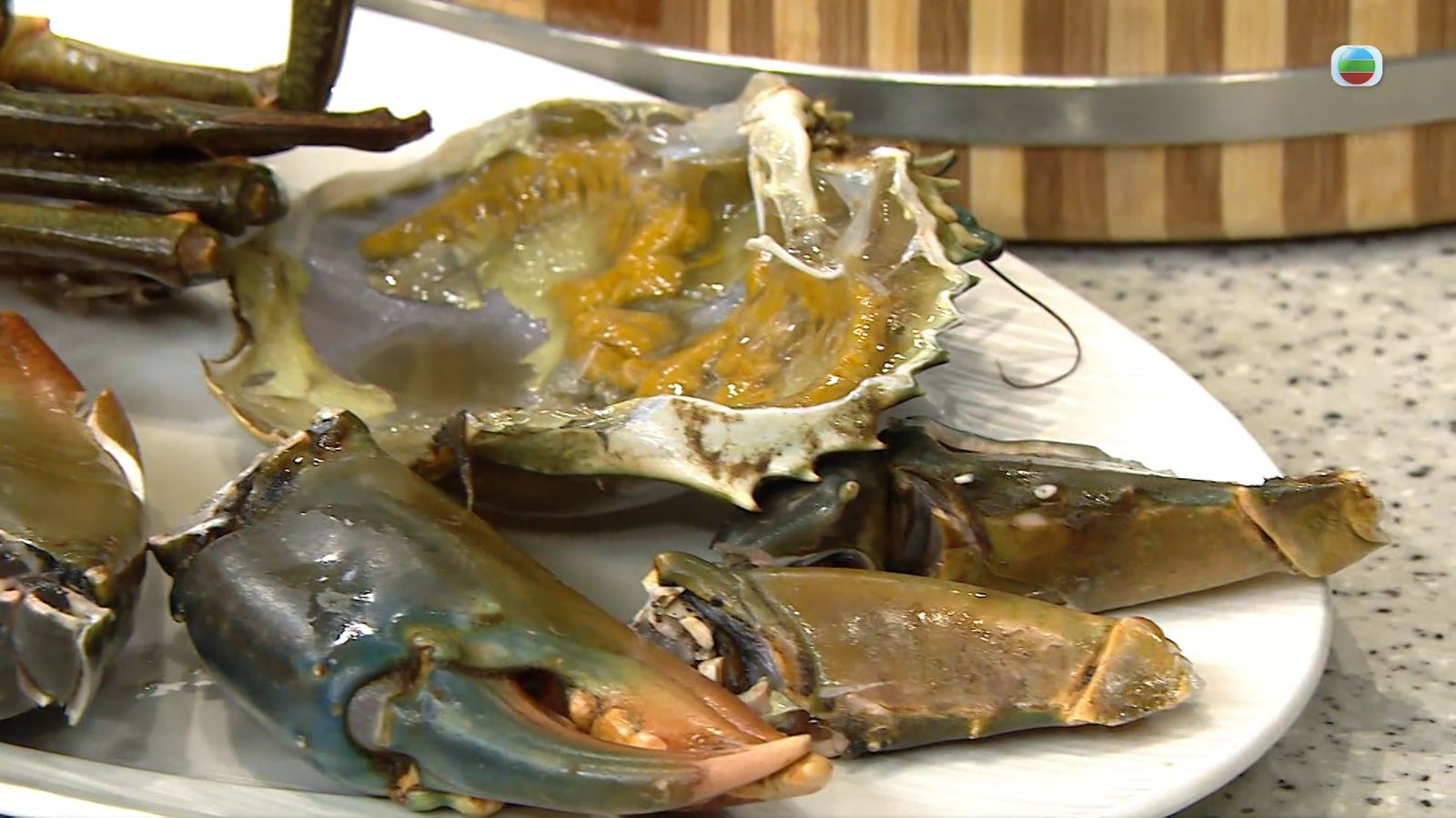 首先把大肉蟹洗淨斬件,Stanley師傅推薦選用公的大肉蟹,拆開之後也不推薦把蟹件拿去沖洗,只要用毛巾抹淨即可。將蟹斬成數大件,拌入生粉和鹽備用,別忘了剁掉殼上較尖銳的部份,並用刀背敲裂蟹鉗部份的殼,好方便進食。