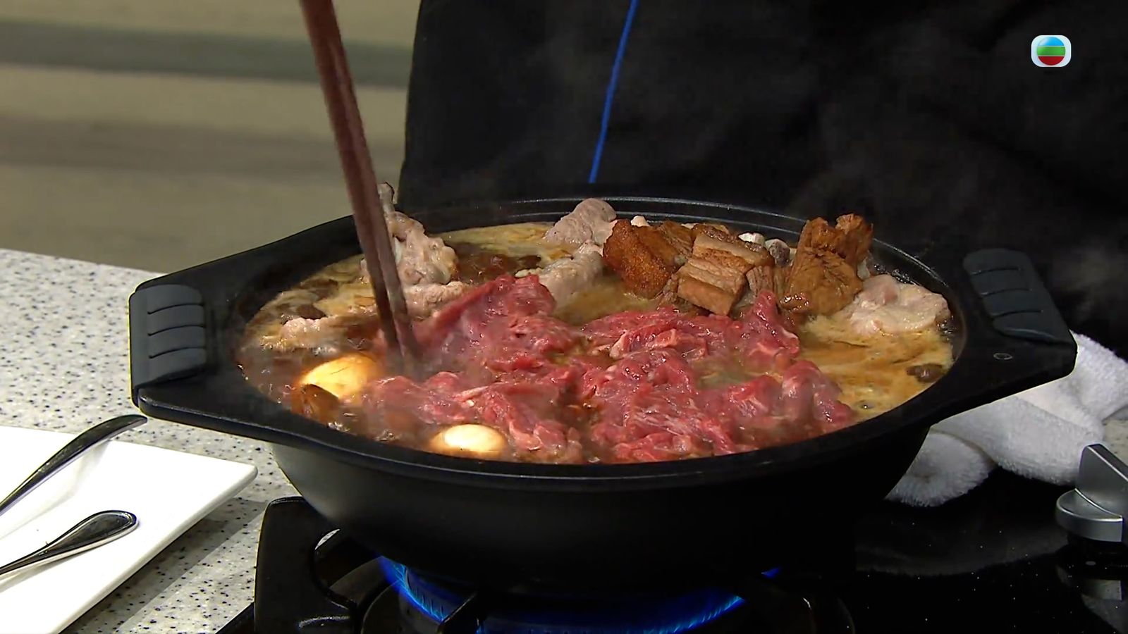 5.將(1)及(4)混合於砂鍋中,依次序放好雞蛋、燒腩、一字骨,注入適量煮一字骨的剩湯,待再次滾起,加入花雕酒,然後放上牛頸脊片,以大火滾至牛肉熟,即可享用。